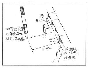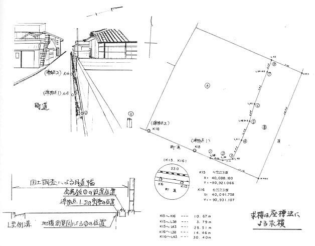 ● 下見 先日、友人から自己所有地の分筆を依頼された。友人と一緒に下見に行くと、依頼地の近 所にはかって私が図根三角点同士を結合トラバース測量で結んだ際の多角点がある。 1点のみ器械点をつくれば依頼地は測る事が可能である。しかも、平坦地で準市街地であ り、コンクリート擁壁やブロック塀で土地が明確に区画されている。更に最近、県道の拡幅の ため、県が依頼地を含む関連地を分筆し所有権移転登記をしている最中であり、県の土木事 務所が作成した地積測量図が提出され、現地には買収位置を示す用地巾杭が残っており、隣 接地との境界にも用地巾杭が、しっかりと入れてある。 「これはいいぞ、簡単に出来るぞ」そして依頼人でもある友人に隣接地所有者と面識がある か尋ねると、面識が無いので調査士のほうで連絡をとってくれとの事。県が入れた用地巾杭の 黄色い木杭は、誰の目にも境界のように見える位置にあり、友人も、「まぁ、この位置なら少し うちの土地寄りだとは思うけれど納得出来る位置だ」。 ![]() ● 辺長チェック 大体の位置を知っていた方が境界の立ち会いもやりやすいと考え、一応確認の意味も含ん で県の既提出の地積測量図に基づいて、用地巾杭間の辺長をチェックしていった。 地積測量図には分筆した新設点の座標と引照点(準拠点の金属鋲)の座標及び点の記が記 載されている。本日は現地の下見であったので簡単に、一番北側の分筆点と思われる点@に 金属鋲があり、準拠点1からの距離も合致していたのでそこから辺長をチェックしていった。 2点目A、3点目B順番にテープでチェック。そして7点目Fへとすべて辺長距離の相違は1 センチ以内であり、さすがに測量会社だけあって測量は真面目にやっている。安心して先程友 人に確認した隣接地と県そして依頼地の三者境界でもあるはずの木杭Gへと距離を確認す る。 ● おかしい おかしい、FとGは20センチほど距離が長い、再度計測するがやはりおかしい、依頼地に 20センチ食い込んだ位置を測量図では境界として扱っている。この位置はおかしい、友人は まだ若いが、父親である土地所有者も私は古くから知っており、土地の管理はきっちりしてお り、信用のある人物でもあり、更にこの土地には古くからの建物が建つているがこの建物位置 にさえ入りこんでいる。 ● こんなはずはない こんなはずはない。隣接地にも用地巾杭が残っているのでついでに確認してしまえと、隣接 地も辺長のチェツクを行った。そうすると隣接地の最初の木杭Hと先程の20センチ食い込ん だ位置から測ると辺長はピッタリ合致。しかし、その木杭から隣接地の更に北側の土地と県と の三者境界についても、丁度コンクリート擁壁の基礎部分に木杭Iが入れてある。やはり、常 識的に境界と思われる位置である。辺長は先程と同様に15センチほど長い、やはり位置が相 違している。更に北方の土地も同様であった ● 印は押された 友人に現地の立ち会いはしたのかと尋ねると「いや、現地ではしていない。測量会社が測量 をはじめる前に工事の承諾書に印鑑をついてくれと言ってきたけれど」、「えっ立ち会いもして いない。」こりゃ登記なんか本来出来ないはずだ、いくらなんでもひどい、県に言って訂正しても らわなくては、現在も県への所有権移転登記とそのための分筆登記が進行中であるため、早 速対処してもらわないと、県自身も大変な事になって収集がつかなくなる。 友人と別れて事務所に帰るなり、県の土木事務所に電話でこの事について、連絡をいれる。 担当の用地係長に事の次第を説明し、電話で説明するよりも、現場で実際に来て見ていただ けませんかとお願いすると、「忙しいので現場にいけない。国土調査どおりにやっているんだか らそれでいいじゃないですか。国土調査は合っていると思ってます。境界確認の承諾の判もも らっているからそれでいいじゃないですか」との返事。 何を考えているのやら。いくら承諾の印をとっているといっても用地測量を開始するに当たっ て、国土調査どおりでよいかとみとめ印をもらっているにすぎず、現地での立ち会いは全くなさ れていない。用地測量後に木杭を打った後、所有者にこれで宜しいですね。と確認し、全員が 承諾しているのであれば、立ち会いをしているといっても良いだろうが、今回のようなやり方は 問題外である。 ● 読み取り ましてや、この地域は昭和50年には国土調査が終了しており、現在のように数値測量では なく、図解法による国土調査の地籍図が法17条地図に指定されている地域である。したがっ て国土調査どおりという事になると、法17条地図を読み取り、現地に近い国土調査に使用し た図根多角点なり三角点を使用して、読み取りの座標値により、その位置を現地に復元する。 当然読み取りによる位置の誤差が考えられ、現地の恒久的地物等との兼ね合い、現地での 当事者同士の立ち会いにより始めて境界が確定されるものである。当