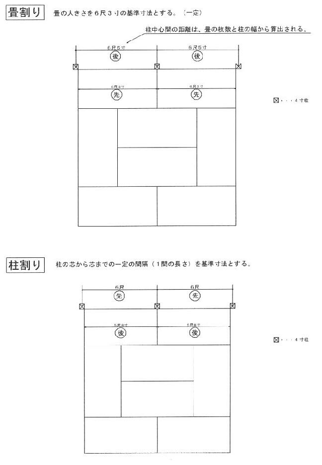 日本の建築物の場合、尺貫法による畳の寸法(1間×半間)を基にした柱間寸法が