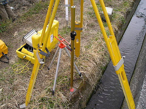 GPSアンテナを測点上に正しく設置する方法を、あれこれ工夫しています。