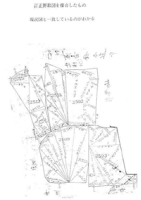 失敗は数知れず、経験年数のみを積み重ね。それでもなんとか頑張っている調査士の境界 確認の方法を上げてみます。 公図地域によく見られる公図と現況とが一致しない場合の調査です。 後の頁に搭載の事例(2509−1)には次の2点に問題があります。 ・別紙の公図と現況図との東側境界線(2503−3との境)が一致しない。 ・公図の北側に国有地(2512−2)が表示されているが民有地である。 この現地を調査するのに、まず下記の資料を収集しております。 (地域によっては保存されていなかったり、閲覧が禁止されているようだが・・・) ・旧閉鎖図面 ・反別畝順帳・・・(明治14年頃迄に作製されている) ・改祖野取図・・・(明治14年頃迄に作製されている) ・地押調査野取図・・(明治18年から21年にかけて反別を更正したもので、この反別が土 地台帳の原始記載となり現在に至っている) ・肩書訂正・・・・(地押調査の際に官有地の存否や幅員を再調査し訂正記録したもの) ・土地台帳・・・・(明治22年3月31日) (参考のため、収集資料のすべてを登載しました) 明治20年6月20日「地図更正ノ件」が大蔵大臣から発せられて、全国の改祖図が、地押調 査とともに、更正されていなれければならないのですが、「齟齬セサルモノハ更ニ調製スルヲ要 セス」の条文があったため、現在と同じく、大変費用と手間のかかる更正地図の作製は省略 し、多くは旧地図を援用して、地押調査による反別の更正のみに留めた。と言われることか ら、このようなケースでは、公図は旧改祖図であることが予想できます。 この事例では、収集した地押野取図を接合して現況図と比較してみました。 明らかに現況が更正野取図と一致し、地図は旧改祖図を援用したことが伺えます。 また、収集した野取図が、更正された地押調査図であるかどうかは、畝順帳と比較し、増、と か減、の表示が野取の反別に記載されている事と、また地押野取の反別が土地台帳の記載 と一致することによって判断出来ます。 また、これらの資料により、公図北側の国有地の表示部分は、1210番、1212番の内溝及 び木生地であり、いずれも民有地であることが確認出来ます。 この事例では、距離や面積もほぼ乙2〜乙3の精度で一致しておりました。 地図訂正の申出手続きは、これらの資料を添付して、利害関係人と共同で申出しておりま す。印鑑証明などは付けません。勿論、境界確認書は添付します。 登記官も、この資料で立件処理しないヤボな方はおりません。 ![]() ![]() ![]() ![]() ![]() ![]() ![]() ![]() ![]() あります。 (時には粗末なものも見受けますが・・・) 更正図の頃になると、測量の作業基準や、それまで「あいまい」な処理しかされていなかった 「畦畔や法敷」の扱いが、はっきりと法制化されたことによるものと思われ、境界確認には大変 役立ちます。 更正図の無い土地の調査は、改正野取を参考にしながら、「えいっ」と目をつぶり、神さんに 一番近い(偉い先生の講話による・・・)所有者同士が談合した境界を、原始境界に仕立てあ げます。時には真面目に空中写真を使います。 争いのある土地は、きっぱりとお断りすると大変気が楽です。 ただし皆さんにはお薦め出来ませんのであしからず。 公図は、17条地図のように、一定の精度や一つの作業基準によって作製されたものは無 く、精度も作業基準も「バラバラ」のものを、かき集めて法務局に納められたものです。 それらの不完全な公図でも、明治から100年も利用してきて、尚現在も十分に利用出来てい るのだから(利用したことあるのかね?)、立派な17条に準じた地図である!・・・と国が言う以 上、ボロ地図め!!と胸の内で叫びながら、活用するしかありません。地籍調査の金さえ出し てくれれば、こんな苦労もせんですむのに・・・。 愚痴を言っても金は出してくれません。 ボロ公図を活かすしかありません。ボロ地図だからと言って、馬鹿にしてボロなりの扱いをする と、ボロのプライドにかけて、落とし穴を一杯作って待っております。 落ちると訴訟が待っております。 落とし穴に落ちないように活かすには、作製時の法令をシッカリ身に付けた上で、過去の資 料を収集して補完しなければ、十分な活用が出来ません。 資料のほうも、100年余りも捨て子扱いされて来たのです、保存状態も一部を除き最悪の状 況です。しかも法令が廃止されているため、保管所の職員も、次第に資料の重要性を認識出 来なくなり、倉庫の隅に追いやられて、ネズミの巣の材料になりかけております。何とか出来な いものでしょうかね!。 そうそう、ボロ地図とは言っても公図は地目別に着色されて、昔の多くの土地情報が盛り込 まれていたのに、マイラーに再製(再悪)したため、情報が省略されて、ボロの上に大の字が付 いて、今では大ボロと成り下がっております。 かわいそうに!!。 公図地域の調査で欠かせないのが、土地台帳の閲覧です。 土地台帳には、一筆一筆の土地の歴史が、明治22年から昭和35年登記法改正