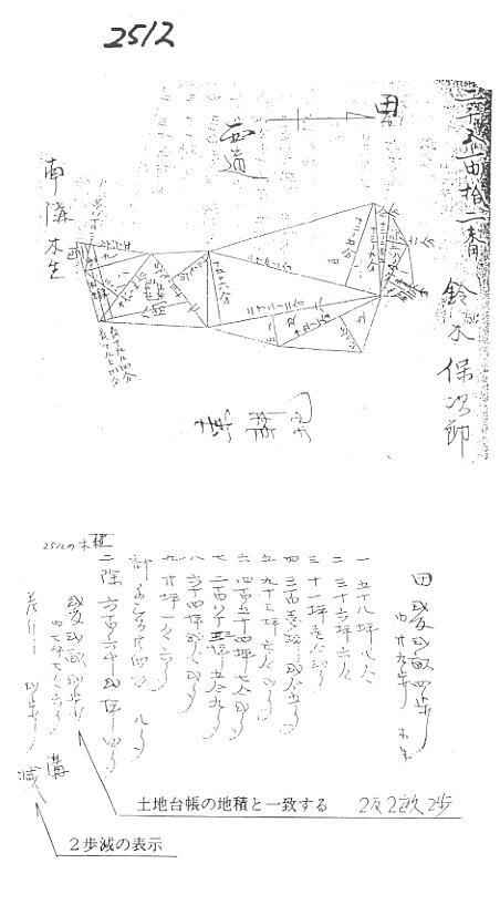 を据え、気分良く測量して帰れば、それで測量が終わるから「ウラヤマシイ!」と、法17条地図 地域の先生方は羨望の目で見ておられるようです。 その通りです!。私の今までの公図地域の測量はピクニックのようなものです。 補正も理論も無く半対回測量で終わってしまう幼稚園並みの測量を深く反省し、せめて義務 教育程度の水準に達したいと積極的にいろいろ各地の研修会や勉強会にも積極的に参加し ていますが、難しくていまだに卒業出来る状態ではありません。それでも、境界線を恒久的に 復元特定するためには、「基準点設置しか無い!」。との結論を実感できるまでにはなりまし た。話はどうも横道にそれてしまいました。 公図地域での作業の実務について自分の業務内容を報告しなさいと言う事ですので、ここか らは私の日常の業務を交えながら説明したいと思います。 土地家屋調査士の職務で大切なものの一つに境界確認があります。 愛媛県の公図地域の公図は、課税のための附属資料として作成され、法17条地図のように 復元を目的にしていなかったため、誤差論や数学的に復元することは不可能で、概ね、公図 やその他の資料と現場が一致していれば、後は合意によって確認するのが現状のようです。 もっとも山口県や香川県に存在する「分間図」と呼ばれる公図は、地籍調査図に匹敵する精 度を持ち、これによって境界を復元しているそうですが、やはり基準点があるわけでは無いの で、合わせ図(不動点法か?)によって復元していると聞いております。 地域差は色々あると思われますが、私が業務を行っている地域の公図は、地租改正作業に よって作成された改祖図(地域により色々呼び名が違う・・・)がほとんどで、先の分間図のよう な優れた精度のものは残念ながら有りません。 しかし、自分の経験では少なくとも作製当時は乙2〜乙3位の精度を持っていた事は間違い ないと信じております。 地租徴収は所有者と課税面積が特定出来れば、その所在や境界が曖昧であっても、徴税に 支障とならないから、権利の登記のみが優先されるようになり、附属資料であった公図の精度 などは、作製以後どうでも良かったようです。 この考え方が慣習となり、その後の分割手続きや、特別法での作業に、大きな影響を与え て、地図を混乱に陥れております。 分割手続きによる混乱は衆知の事実なので、余り知られていない特別法による混乱の例を 上げれば(塚田先生の講演の中から採用させていただきました。) 明治33年 地上権に関する法律・建物保護に関する法律 この施行により、借地上の占有境界と法定境界が混同され、その後の手続きが 占有境界によって行われたため混乱を生じている。 昭和6年 農山村漁村振興法 これにより農道、水路などが整備され、公図と違った位置に付け替えられたが登 記処理が放置されたため、後日違ったままでの現況で分割されたりして、混乱し ている。 昭和15年 国家総動員法 国益のための名目で、公共事業、軍事産業の用地を取得するため、公図や境 界線を無視した強制供出をさせたが、登記手続きはしなかった。 このために、現在地図混乱地域となっているところが多い。 昭和18年 土地休閑地を食料増産のために増員する件 布達 これにより、河川の高水位敷、国府県道等の並木、溜池の堤塘敷、農水路の 法面、土揚げ場などが開墾され、現在もその多くが占有されたまま、測量分筆さ れ混乱の原因になっている。 昭和21年 自作農創設特別措置法 最も地図を混乱させた原因は、この時であったようです。全国で3860万筆の土 地が適用を受け、その登記手続きは緊急を要したため、すべて占有境界で処理 されたり、字の区域を越えて合筆されたり、公図の上で分割して売り渡し、現地 は好きな所を占有させたりしたため、大混乱している。 その後も永い間、権利優先の考えのもとに、登記手続きがなされたことによって、地図が混 乱し、現在に至っているのは衆知の通りです。 100年余りもの間、このような粗雑な扱いを受ければ、公図でなくても作製当初のまま残るこ とはありません。今も市民がこの悪習慣から抜けきることが出来ないでいるのは当然です。 昭和35年には廃棄される寸前でした。 それゆえに、境界線の確認も声の大きな者に左右されたり、当事者の都合で境界線を当た り前のように動かしたり、勝手に改変された境界線を躊躇なく(実は躊躇する知識も無かった が・・・)原始境界に仕立てあげ、当事者がここだと言えば、そこが原始境界になると言う、実に 「あいまい」な作業が長年に渡って行われ、それを公図の粗雑さのせいにして長年、土地家屋 調査士の名声を高め(低め?)てしまった。私もその筆頭者です。 昭和48年に香川の塚田先生から「公図の年輪」と題した講義を受けました。 内容は明治期の地租改正作業でしたがこの講義には本当に驚きました。晴天の霹靂という か、当時の地域の社会背景では、境界確認に地租改正法が持ち出