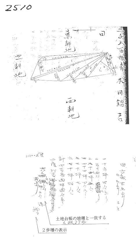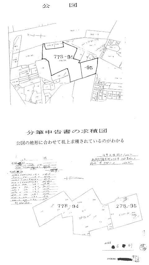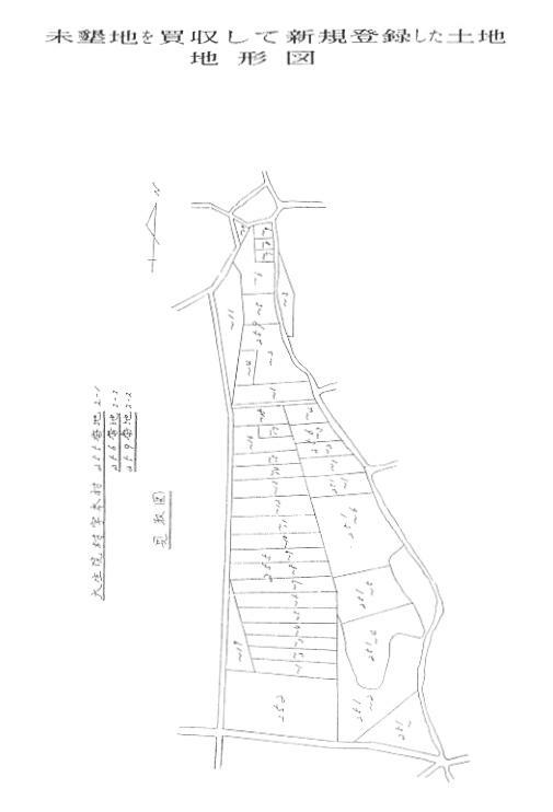 ![]() ![]() これは、政府が(都道府県知事)、開墾見込み地(未墾地)を買収して、耕作能力のあるものに 売り渡すため、台帳閉鎖して、新たに登録地成(表示登記)等をする為の特例で、山麓地等で 多く見られます。 一つの字の地域で、200筆もの登録地成が見られる所もあります。 次頁の事例は、測量求積されたが、申告手続きの際に、所在図の作製を誤ったために、現 況と公図が齟齬している事例です。 この事例、申告の際に、2411番40と2411番41の土地の、所在図の作製を誤ったため に、その後、隣地間で争いが生じ、調査したものです。 求積図では、どちらも進入路があるのに、所在図では袋地となっている事に起因します。 この事例のように、過去の資料調査を怠ると、原因がはっきりしていても、争いを解決するこ とが出来ません。 次に添えた事例は、ある地域の登録地成の、求積図と所在地です。 この地域では約200筆の、新たな土地が登録されて売り渡されております。 この地域の調査をするには、土地台帳を閲覧し、これらの資料を収集しなければ、一筆地の 筆界調査は不可能です。
