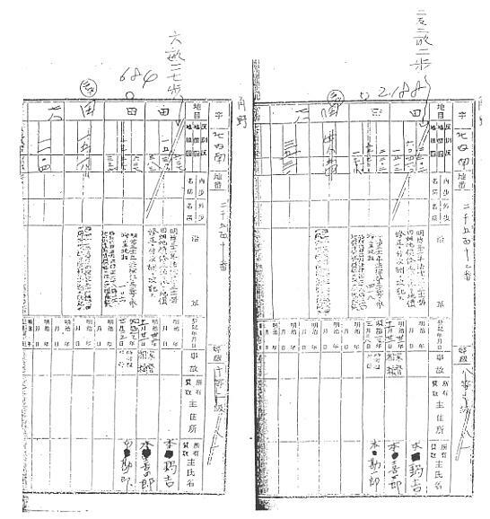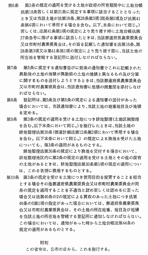![]() ![]() 自作農特別措置法の適用を受けた土地は土地台帳の閲覧を要する。 昭和21年施行の自作農の適用を受けた土地は、全国で3860万筆に及んだと記録されて おります。 昭和60年の全国の土地は、推計2億3000万筆(登記白書による)と記されていることから も、いかに膨大な数であったかが伺えます。 これらの登記手続きは緊急を要したため、特別法で数年の内に処理されております。現在同 様の処理をすると30年はかかると何かに書かれてありました。 現在の登記簿にも、移転登記を省略した「欄外登記(ミミ登記)」をよく見かけます。 表示に関する登記は「大蔵農林省令2号」(次頁資料の通り10条の条文からなる)により、分 筆、合筆、台帳閉鎖、登録地成の台帳処理がなされ、その分筆申告書や通知書の控えが、市 町村の農業委員会等に保管されております。 これらの表示登記(申告)手続きも、緊急を要したことから、誤りや公図の手入れの出来てい ないものが多く、土地台帳を閲覧して、大蔵農林省令の手続資料を収集しなければ、所在や 境界の確認が不可能なものが大半です。 ここでは、大蔵農林省令2号2条の代位分筆、5条の登録地成の事例をあげてみます。