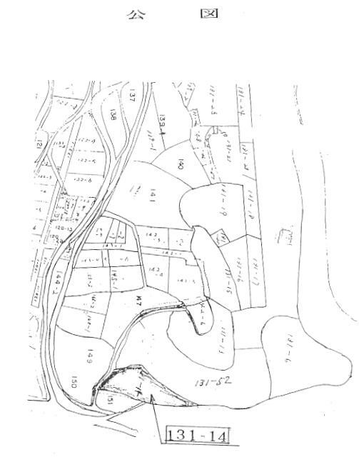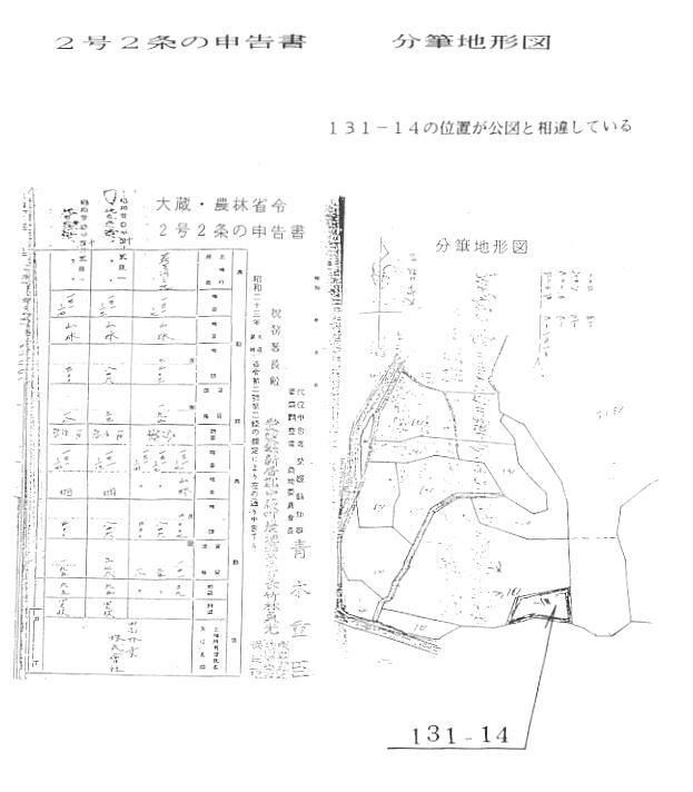 ![]() ![]() 2号2条の事例 これは、政府が(都道府県知事)買収等をしようとして、分・合筆・地目変更の手続きが必要な ときは、土地所有者に代位して申告ができる特例です。 この特例事例によって買収し、売り渡された土地が、集計出来ない程沢山あります。 次頁の事例は、131番14の土地の現況と、公図の所在位置が相違するので調査した事例 です。 土地台帳の沿革欄に、「昭和23年大蔵農林省令第2号第2条の通知を受け本番の14を付 し別紙に登録」と記載されております。 この閲覧をもとに、私の業務地域では農業委員会に行き、保存されている申告書の控えを 収集します。この資料収集で代位分筆された131ー14の土地が、公図の位置と明らかに相 違していることがわかります。 このようにして、所在位置の確認は出来ても、境界の復元はできません。 それは緊急を要したためか、測量しないで机上分筆で面積計算されているためです。 境界線の特定は、現況と土地所有者の合意に頼るしか方法はありません。 求積されている土地でも、乙2〜乙3の精度で現況と一致することは、ごくまれにしか見られ ません。精度内であったにもかかわらず、その後の社会の混乱で、境界が大きく変動したのか も知れませんが・・・・。 いずれにしても、自創法による取得は「原始取得である」、と言われたことから、地図訂正を することもなく、隣地や国有地を取り込んで求積し、売り渡しているのだから、公図と一致する はずがありません。 後始末をする調査士の苦労を、理解してくれる人はおりません。