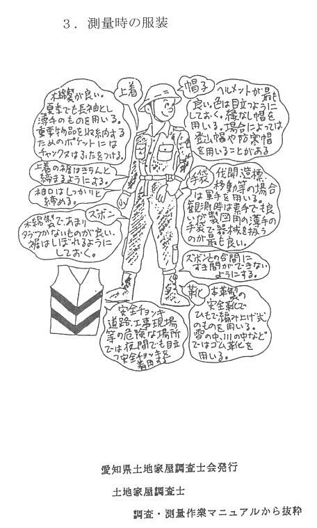 当然事務所は備える必要があるが、欲しいものとなるとキリのない話になる。 そこで通常の業務に必要とされるものについて考えてみよう。 1.事務所内に必要なもの @電話・fax 出来れば、電話とfaxは別々に欲しいもの、当然電話は留守録付きのものが良い。 ついでに携帯電話やポケベルも必要かも。 Aコピー機 最低でも縮小・拡大の出来る機種、更にA3判が焼ける器械が欲しい物です。 そして予算的に余裕があれば無理をして高速のものが良い。 Bパソコン・測量ソフト パソコンについては、最近の安価な器械でも驚くべき機能があり、十分測量ソフトが走り ます。製図や計算の事を考えたら労力の節約になります、最初に思い切って買っておき ましょう。慣れてしまったら体の一部のようになります。 どこの測量ソフト会社のソフトを使用するかは、実際に操作してみて、じっくり自分にあっ たものを探すべきです。 C自動製図幾 パソコン・測量ソフトとともに、最近安価なものもあり、思い切って買ってしまおう、プロッ トミスも無く、図面が美しく仕上がります。 D予定表 黒板でもホワイトボードでもよいですが、事務所内の見易い場所に予定を書いておくも のがあると便利です。予定を忘れ、立会いをすっぽかすとお客様の信用が無くなりま す。 E製図用道具 当然、必要です。 自動製図機があっても、どうしても漏れが会った場合は、補正する必要があります。 F封筒・名刺 自分の仕事のPRをかねて、自分の事務所名いりの封筒や名刺は必ず必要です。 G整理箱 調査士の資料はあっという間に溜まるもの、当然整理して保管する場所が必要です。 H必要書類一覧表 現場で、依頼人に必要書類を説明する時、口頭では誤りも多く、後々、言った言わな いで気まずくなる事があります。それでは、最初から、必要書類一覧表を作製し、その 必要書類に丸印をして渡せば意外と意思の伝達がうまく行きます。 Iカメラ 主に現場で立会いの状況、境界確認用の写真、地目変更用の写真、測量の現地の 詳細の点の記としての写真と我々調査士にはかなりの戦力になります。 ただし、いつも予備のフイルムを用意していないと、急ぐ時に間に合わないのでご注 意。 2.測量に必要な道具 @車 これはもう必需品そのものです。我々調査士は比較的荷物が多いので、ライトバンや 今頃はやりの軽の1ボックスカーなどは手頃と言えます。 A光波測距儀・トータルスティション 今から購入される方は、トータルステイションを購入しましょう。 現在の測量の進歩から考えても、10秒読み以上(2級経緯儀・2級トータルスティショ ン以上)のもので着脱式のものを購入された方が良いでしょう。 購入時の価格差と、必要時の買い変えの費用を考えると、最初から購入しておくほう が良いようです。 B三脚 願わくば、光波測距儀用の木製精密三脚とミラー用の金属製大型三脚が必要です が、金属製三脚2脚でも可。 Cミラー・ピンポール・ピンポールスタンド ちょつとした測量や、1筆地の境界を測る場合に必要です、これらも2つ以上は必ず 必要です。 D布テープ・スチールテープ 布テープは建物の測量や、道路の横断の距離をとる場合に便利です。 スチールテープは、検測や実際の距離の測定に使用します。出来れば検定を受けた テープを使用したいものです。 E掛矢・ハンマー 当然、杭や鋲の打ち込みに使用 Fポール・箱尺 境界確認用の断面をとったり、写真での申請地の中の位置特定の要素として使用。 Gスコップ(小)・Wスコップ、ショウゼン・鋼鉄タッパー 固い地面に穴を開ける。 Hバッテリードリル、エンジン付きドリル、カッタードリル 会標等を設置するためにコンクリート擁壁等に穴を開けたり、削ったりする。バッテリ ードリルは音の静かな市街地向き、エンジン付きドリルは、馬力が必要で大量に穴を 開けたり出来るが音がうるさく山間部向き。ただし、小さい径のドリルの刃先はすぐ駄 目になるので、常に予備の刃先が必要です。 Iペンキ(スポットマーカー)、スプレー 立会い時の申請人の指示のあった位置とか、逆打ちのための境界標識埋設のための 印として使用。 また、境界線を復元する際に反対側境界からの重複した距離について、関係者に目 で見せるための効果的な用具としても使用出来る。 J測量杭、鋲、釘 実際に測量にかかった場合、器械点、準拠点、引照点、復元点に使用する。特に準拠 点や器械点については、外の職種のものと区別するために、ステンレス鋲を使用すれ ば、簡単に判別する事が出来る。更に刻印付きの明示板を使用すれば明確になる。 K鎌、のこぎり 現場で邪魔な雑木の枝とかを伐採する。 3.あると便利、小物類 @コンペックス 現在2〜10mまで各種、色々なコンペックスが販売されています。5mと10mの二種 類があれば、ほとんど間に合います。器械高、断面、辺長の実測の測定、使用用途 は一番多いものです。 Aブラシ コンクリート等の汚れを落として、会標等の接着をよくします。また、三