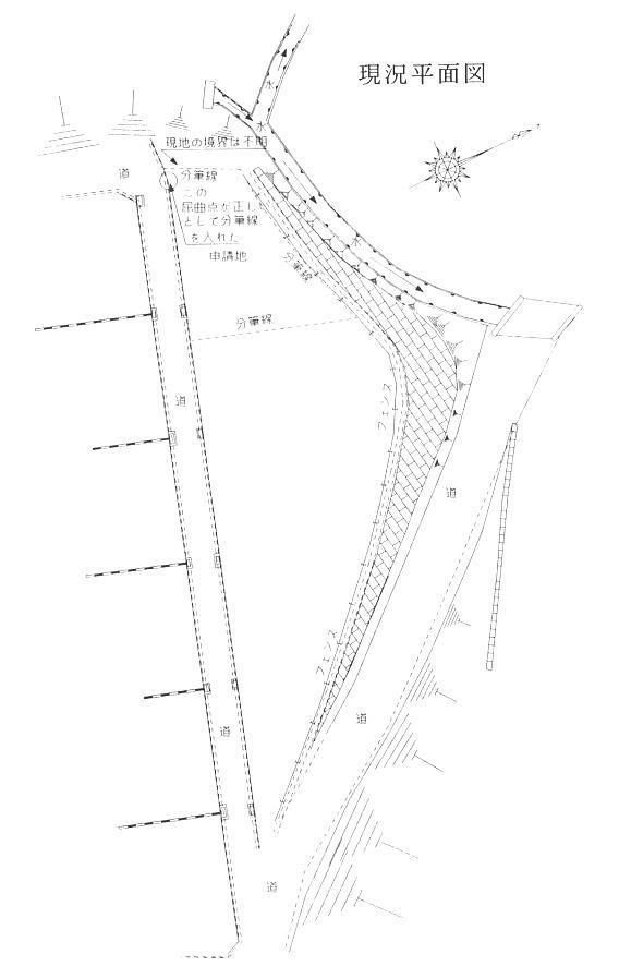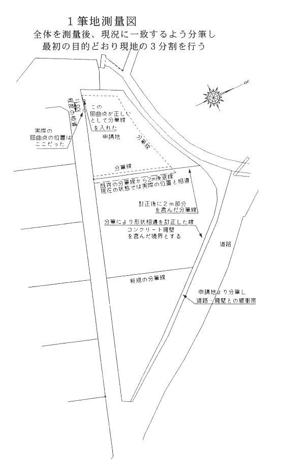 ● 今は昔 もう、12年以上が経過しようとしているが、私が開業してまもなくの仕事。苦い思い出として、 心の片隅に焼き付いている事件がある。 土地家屋調査士であった父親の仕事を、脱サラして補助者として手伝い始めた(もう16、7年 前になる。)その頃の父の土地測量については平板が主体であった。 既に土地家屋調査士の測量の仕事はトランシットが主流となりつつあり、辺長や面積にしても 5センチ単位ではなく、1センチ以下の単位の精度が要求されつつあり、これは若い自分がや らなければと、父が調査士会の斡旋で購入したまま事務所の片隅で埃をかぶっていた20秒 読みのトランシットを見様見真似で何とか操作し始め、今にして思えば電卓に毛の生えたよう なパソコンを使って、自分でプログラムを組み、測量計算をして、ヘロンの公式で面積を算出し た後、底辺と高さを計算し、三斜法に計算を直していた。 当然、求積については座標法などという考えは全くなかった。それでもその頃は、父親は10万 円もしたカード式電卓(現在買えば、恐らく1000円程度の電卓の機能)や算盤で、測量計算を していたから、それに比べれば随分進歩したものだと内心得意でもあった。 事実、現在ほとんどの土地家屋調査士が持っているパソコンを使ってのプリンタープロットの 測量ソフトの業者の売り込みは、それから2年後であったから、田舎の土地家屋調査士事務 所としては、そんなに時流に乗り遅れているとは言えないであろう。 そういった状態で父親の補助者として5年間経験を積み、何とか出来の悪い頭をだましだまし 使用し、人より余分な期間をかけてやっと土地家屋調査士試験に合格した頃の話である。 ●依頼 それは、旧知の方からの依頼であった。 何でも、親戚に頼まれて自分の所有する宅地の一部を分割して、売買をしたいという事であっ た。 現場は事務所の近所であり、町が分譲をしている団地の一角であり、区画も道路で明確であ る。これはなにも問題はない、依頼人にも何ら問題も無く、隣接地も分譲を行った主体である 町所有の土地(町道)のみである。 当時、平板測量をそのままトランシットに切り替えた測量、つまり任意座標で測量をしていたも のであるから、特別用意する訳でもなく、法務局から17条地図を閲覧し、トレースをし、隣接所 有者を確認しただけで即座に測量に出かけた。 依頼人の指示のあるとおりどんどん測量をしていく。現地は7、8年前に分譲されており、依頼 人の記憶もまだ明確で、更に道路にはL型側溝があり、境界は明確である。 ● 広大な地形 現地は、山を切り崩した造成地のため、付近の既存の宅地からは15m程の高台になっている 土地で、丁度真夏に食べるすいかの切り身のような形をしている土地であった。 中身の部分(有効利用の出来る平地)と、皮になる部分(法面)があり、周りはすべて町道に接し ており、すそ野の部分の既存宅地から、それぞれ高台へ進入する二本の町道が依頼地を囲 むように登っており、全部が町道に接する形状の土地であり、約2000uの広大な土地であっ た。 親戚に売買する区画は、そのうちの約200u程の土地であり、法面を含まない土地、つまり 有効利用出来る平坦地のみを売買するという事であった。 取りあえず、現地に依頼人の指示する新設の境界点に不動標識となるものを設置していく。 新設点となる分筆点にも不動標識を入れ、確定測量を始めるが、広大な土地で、既に国土調 査を終了し、その後土地の造成を行い、町が改めて合筆し、区画毎に分筆を行っており、土地 の形状は合致しているようでいる。 今回の依頼で分割を開始する場所は、地図上に表示されている明確な境界点からの分割で はなく、いわゆる日の丸分筆のようなものだった。一方向のみは丁度元地の平坦な部分、つま りすいかをかじりつく直線となっている部分に町道が接しているから、大体の位置は解るのだ が、全体の地形の中での正確な分筆の位置というと明確に基準にする境界がない、ただ現地 に1個所、屈曲点があり、地図上にも同様な屈曲点が表示されている。曲がり具合も150度程 度で同様である。 ![]() 地図上では一番明確で間違いなく分筆線の位置を確定するには、登ってきた町道が、高台の 造成地側のほぼ直線の町道と交差する地点(丁度三角形の頂点となっている位置)を測り、そ こからの位置が解れば、ほぼ正確であるはずなのだが、残念ながら大体の状況は解るのだが 現地は、個人所有地は余裕を持って分割されているようで、町道の中にその地点がくるようで あり、明確では無い。 そのため、求積する部分は当然だが、ほぼ直線の道路の反対側の分譲地の現状の区画線を 確認の為測り、町道の屈曲点も測り1時間程度で測量は完了、当時広大な地形であれば残地 部分については、求積は必要とされておらず、当然この場合は広大な地形であり、残地部分 の求積を行おうとすれば、かなりの手間を要し、その必要はないものと思われ