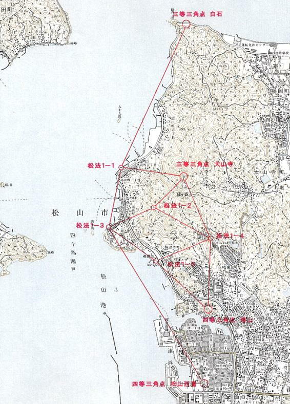 池の基準点から山道の基準点までは5辺、7点で結ばれている。