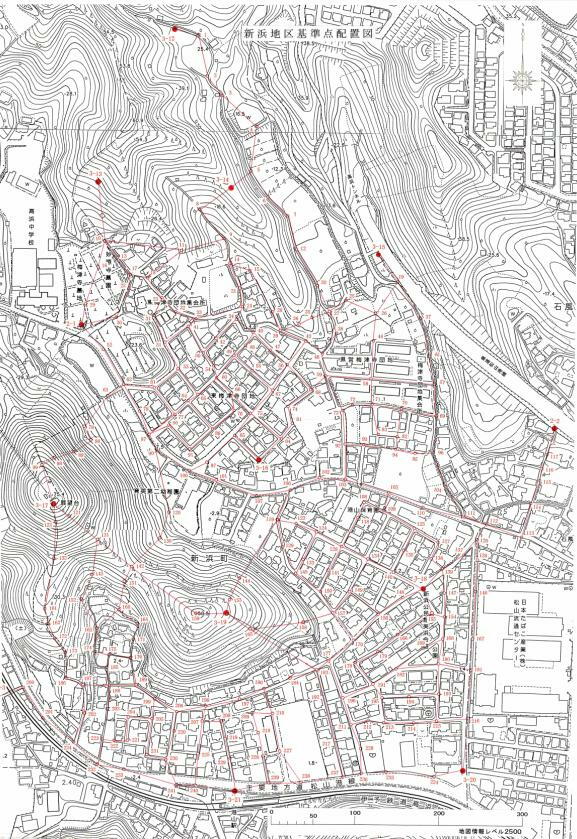 霊園裏の基準点から中学校横の池を通り、見晴らし山の展望台の基準点3−19に結ぶ路
