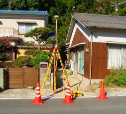 高岡町基準点設置作業 12 ( 図根多角点間距離チェック ) 平成20年11月15日、午前7時調査士会館駐車場集合。 本日は午前中GPSの点検測量、午後はTSで図根多角点間の距離のチェックを行う予定である。 本日は松山支部の基準点測量研修が午前9時から開催されるので、午前9時の研修に間に 合うようにGPS受信機を設置し、電源を投入しなければならない。 その後、松山支部の研修に参加しない者がGPS観測中の見張りを行い、GPS観測を終了させる。 午後研修終了後に、再び全員でTSによる図根多角点間の距離のチェックを行うこととされた。 GPS点検測量 法3−28、法3−27、街区三角点1004A 、街区多角点30C54、図根多角点T4208を使用して GPS点検測量が開始された。 いずれも1mポールを1本継いでの観測である。 各観測点も2人一組で、持参したTSを使用して2方向からポールの垂直を確認しながら、整準 ねじで調整しての据付である。 松山支部の研修があるため、参加者は午前8時30分には会館に向かわなければならない。 残された3人が5つの観測点の監視をしなければならない。 いつも、GPS観測の際には眠ってばかりいる老眼おっさんだが、今回は街区多角点30C54 図根多角点T4208の2箇所の監視をすることになった。 200mほどの近い距離なのだが、カーブがあるため2つを同時に監視することは出来ない。 2時間の間、歩いて2つの場所を行ったり来たりする忙しい監視となった。 図根多角点T4208では 図根多角点T4208では、白い野良犬が出現する。 TSの観測中でも、このあたりで近所の犬がいきなり吼え、犬の喧嘩が始まっていた。 どうやら、その原因となっている犬のようだ。 じっとこちらの様子を伺っている。 首輪のない白い犬はおとなしく、吼える様子も無いが飼い犬のように尻尾を振るわけでもない。 野良犬にコードをかじられたり、三脚を倒されたりしては大変と、受信機のそばに近寄り、犬を 睨み付ける。 白い犬は目の前で座り込み、私を無視するように後足で頭をぽりぽりと掻き始め、しばらくする と厭きたように去っていった。 家庭内の立場を犬に見透かされ、馬鹿にされてしまったのだろうか。 ![]() 野良犬が出現するT4208 街区多角点30C54 街区多角点30C54は煙草屋さんの横に流れる川(水路)の橋のコンクリート製の橋脚に設置 されている。 ここも1本ポールを継いでの観測である。 観測開始から40分ほど経過。 たばこ屋さんの反対側が駐車場になっており、交通量の多い場所である。 図根多角点T4208と行き来している間に移動していないかと心配になり、求心望遠鏡を覗きこむ。 黒い点と街区多角点の十字が別の場所にある。 「あっ、求点がだいぶズレている。修復しなくては。」 またポカをやってしまったか、時々、求心を忘れて観測したりする老眼おっさん。 大事な時にまた、やってしまったか。 迷惑おっさんのムチの音が聞こえるようだ。 慌てて整準ねじに手をやろうとした瞬間。 「待てよ。」 どこかで冷静な自分が居た。 「そうだ、ここはポールを1本継ぎ、TSで2方向から調整したのだ。整準台の求心をした後 整準ねじで調整しているから狂っているのは当り前だ」。先ほど、犬に馬鹿にされたせいか 冷静な自分が居た。 ここは、何も無かった、事にしておこう。 距離チェック 松山支部研修に参加していた皆が昼食のお弁当を買って帰ってきた。 全員で昼食を済ませた後、観測距離のチェックを行なう。 基準点測量では、距離は片方向からの距離を使用するのだが、今回の図根多角点の観測 は、距離については観測の出来る状態であれば全て観測している。 厳密な精度を追求し、ピンポールとミニプリズムを使い、高さを10p以上あげないようにして 止むを得ない場合にはターゲットを使用している。 チェック用に迷惑おっさんが作成した観測図を見ると、図根多角点の点間が蛍光ペンで塗ら れている。 「この図の中で色をつけた場所が、図根多角点間の水平距離がTSの観測位置が入れ替わった ことによる違いの差があったところなんよ。黄色が距離の較差が2o、緑色が3o、青色が4o あった場所よ。 今日はどちらの方の観測距離が正しいのか、どちらを使用すべきなのかチェックする予定 なんよ。」 何と、細かい。 最初から片方向の距離の観測であれば、ここまでのチェックは必要ない。こんな面倒くさい ことを自身に義務づけしてしまう。 片方向からのみでは無く、両方向の距離を確認することは自分の業務の小さな範囲の少ない 基準点数であれば、当然行っている。 このような大きな現場で400を越える観測の2倍の数をチェックするのだから、もう、・・・・だ。 さぞかし名のある 15時を過ぎようとしている。 アスファルト舗装をはつり、道路の金属性の汚水枡にセメントでくっつけた図根多角点に ミニプリズムを設置していたが、観測終了後、片付けようとしゃがみこんだ時だった。 杖を突き、散歩をしていた白髪頭の品の良い小柄な75、6歳のおじいさんが 「これは一筆地の丈量のための観測をしているの