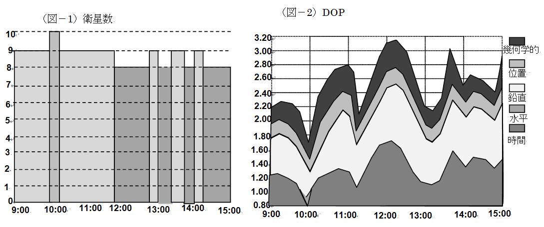 (GPS観測計画) 国土調査を昭和40年代に実施した田舎では,測量法の改正により日本測地系が世界測地系になっても,国土調査に使用した4等三角点は電子基準点を使用しての改測がされず改算で成果が変更されています。 したがって,1筆地の境界点を表す座標値も国土調査での座標をパラメーター変換した座標系,国家三角点の日本測地系をパラメーターにより変換した世界測地系での座標系,(直接または間接に)電子基準点を使用した世界測地系の座標系と3種類の座標系による座標が混在しています。明らかに相違する座標系では無く,そのまま同一の座標系として使用しがちなのですが,これらの座標系の相違を知り,調整しながら使用しなければなりません。 1級・2級・3級基準点測量はGPS測量で設置する。4級基準点はTS測量により水平網・高低網の厳密網計算で行う。1筆地測量は4級基準点から実施して,当事者の立会による境界点や国土調査(不動産登記法第14条第1項地図)との比較を行い,現況測量により得られる国土調査時の座標系と今回のGPS測量による座標系のズレの調整を行った後,再度確認をして地図訂正が必要か否か判断します。確定した境界点については新たに設置した基準点からの座標値で最終的に表示する。このような方法で私は1筆地測量を実施しています。 山に囲まれた盆地・海と急峻な山との間の狭い地域で業務を行っている調査士にとって,国家三角点は山の頂上にあり毎回々山頂まで機材を担ぎあげて基準点を設置するよりは,電子基準点が使用出来るようになり電子基準点のみを使用して1級基準点を新たに設置しておけば,簡単に2級基準点,3級基準点を設置することが出来るので,1筆地測量の為の基準点をまんべんなく設置することが出来ます。 観測計画というもの 非常に便利になったのですが,以前に比べ事前の準備をせずに簡単にGPSを使用してしまっている事を知る事になってしまいます。新設基準点を設置する時に観測点の状況を良く調査して観測計画を立てるべきなのです。観測の回数が増え慣れるにつれ観測点で基準点を設置した時に大体の状況を自分なりの感覚だけで障害物の状況を判断していました。 ![]() 今から説明する事例は2012年9月22日にGPS観測を行ったものです。 たまたま近傍地の業務処理中に今回の申請地についても分筆業務の依頼があり,周辺の状況も分っていましたので3級基準点3点をこの地域全域に設置しておこうと実施したものです。 観測時間を決定するにあたっては,インターネットで放送歴を入手して,解析ソフトであらかじめ(図−1)の衛星数,(図−2)のDOPを確認しました。観測点の障害物情報は現地で器械により正確に観測せず,自分の感覚により状況判断しました。 与点の2級基準点2−1は海岸の広場にあるので障害物は無いのですが,山の中腹にある2級基準点2−5,2−4は向き合った形で障害物のある方向が相違します。ミカン畑にある基準点は海岸に向いた方向の上空は開けていますが,山頂に向かっては傾斜があり水平方向の100°程度を占める範囲では仰角が20°程度までふさがっています。3級基準点3−15についても海岸の国道の路肩にあり,車が1台駐車できるほど余裕があり西側の山だけが障害物のようです。新点の3級基準点3−22,3−23,3−24についても海岸の建て込んだ住宅地の中ですから障害物はあります。 それでも仰角20°前後までの障害物であれば,衛星も8個以上ありDOPも3.20以下だから,結果的に全方向が埋まっていても大丈夫と,衛星の配置等詳しい情報を確認せず,今までも出来ていたのだから大丈夫と判断しました。 ただ,新点3−24については切り立った山の土砂災害防止の為のコンクリート擁壁上に設置しており,急斜面で障害物も多いので上空に衛星の多い時間帯に観測する必要があると思っていました。 観測開始 (図−2)のDOPの状況から3−24をするにあたっては9時30分〜10時30分の間か
