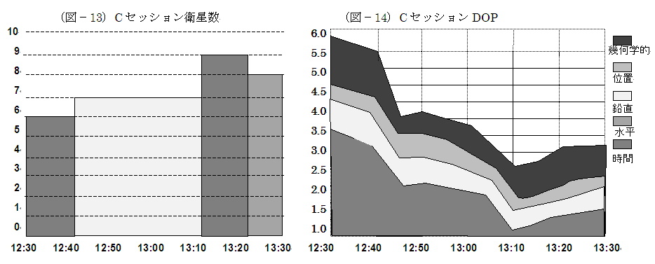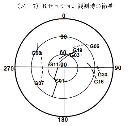 北の方角にはもともと衛星が飛来していませんが,仰角15°から45°の間の衛星をみるとG01,G07,G08,G06,G16,G30,そして天頂に近い位置にG03,G11,G19の衛星があります。 このままであれば何も考察する必要は無いのですが,観測点にはそれぞれ障害物(カーテン)があります。同一セッションの観測点では同一の衛星を受信する必要がありますが,観測点の障害物により(図−7)の衛星の中で受信できないものがあるのでしょうか。 そこでBセッションで観測した時間帯の衛星の状況(図−7)と観測点2−4,3−22,3−23,3−24地点の障害物(カーテン)情報を,一つに合成して(図−8)のBセッションカーテン情報を作成してみました。 ![]() 観測点周辺の障害物によりこの時間帯ではG01とG08が隠れてしまいましたが,G08を補足するようにG07が,G01を補足するようにG11があります。 南東部分に障害物がありますが,幸いな事にG16とG30衛星の邪魔になっていません。観測終了と同時に障害物に隠れる状態であり観測や解析にほとんど影響を与えなかったものと思われます。解析ソフトに障害物情報を入力して改めて衛星数(図−9)とDOP(図−10)を計算してみました。 ![]() 衛星数・DOPともに障害物の無い状態と比較すると悪くなりました。受信可能としていた衛星も9衛星から7衛星になり,DOPも2.10〜3.20程度のはずが,実際には2.5〜4.3になってしまいました。 観測計画に使用した(図−1)と(図−2は観測点の障害物を全く考慮していないものです。想定内の範囲なのか衛星の多さに助けられた観測だったのか後日観測計画の立案者は知る事になります。 Cセッションを分析する 今度は問題のあったCセッションをみてみることにします。(図−6)から12時30分から13時30分の1時間分だけを取り出して(図−11)を作ります。
