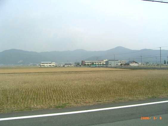 一方、電子基準点 宇和は右側の岩城小学校グランドにあります、右端の木の近くにボンヤ