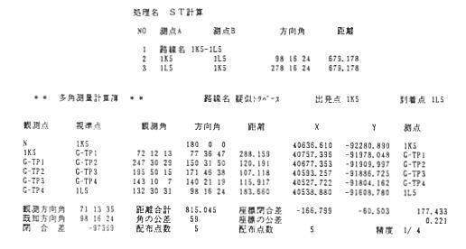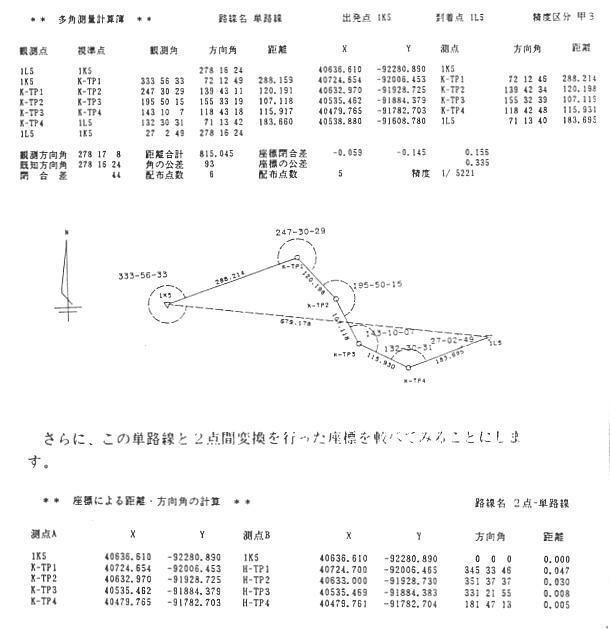 さて、今から疑似トラパースについて説明したいと思いますが、この言葉を耳にされた方はい ないと思います。それも当然の話で測量の教材をいろいろ読まれても出てこないはずです、何 故なら本当は行ってはいけない事だからです。 それをわざわざ取り上げるのは何故かという疑問やお叱りもあると思いますが、この方法を 取り入れることによって、図根点や三角点からの測量が身近に感じられると思いますし、もし 最悪の場合はこの方法があるからどんどん三角点を利用してトラパース測量をしてやろう、と いう気持ちが生まれてくれば幸に思います。 それでは、前項の2点間変換を利用して開放トラパース点を変換してみましょう。 まず、変換する対象となる2点は図根三角点とします、そのためには、任意の測量点を原点 (0。000,0。000)として測量を行います。 ここではその任意の原点を0−TP1として図根三角点1K5を後視として出発(Nと同一視して、 0度とする、ただし、任意の座標であるのでこの場合の1K5は放射により求めることとなる)し、 後続の点については開放トラパース測量を行い片方の三角点1L5に到着する測量とすれば、 任意の1K5(0−1K5)と1L5(0−1L5)の座標値を得ることが出来る。 ![]() ![]() 図根三角点1L5の座標値は同一の地点をあらわしている訳であるからこの2点が同一であると して2点間変換をかければその開放トラパース点である0−TPl,0−TP2,0−TP3,0−TP4に ついては、すべて公共座標に変換出来ることになる。 変換の計算書は以下のとおりである。 ![]() な角度で良いということになるので、開放トラパース測量の原点を1K5として0−TP1を0度として 視準し出発したと仮定しても良いのではないか、そうするとこのような開放トラパース測量となり ます。 ![]() これも同様に2点間変換をかけてみると、全く同様の答えとなりました ![]() 標の関係はどうなっているのでしょうか。 以下、計算書と路線図を記載します。 ![]() 発る誤差程度だと思われます。 しかし、この方法は単路線に較べてどの程度信頼できるのでしようか、もう1つ事例をあげ計 算してみます。 この方法は片方の三角点を原点として計算しています。 ![]() ![]() ![]() この単路線自体もあまり好ましい路線の組み方とは言えませんが、現場ではこのような路線 をやむを得ず組む場合も少なくありません。 そのため三角点から他の座標を持った図根点なり三角点を見る事が出来れば問題はありま せんが、このような方法をとる場合は、他の図根点や三角点は当然、見通しが出来ず、三角 点から偏心をしようにも出来ない場合です。 しかし、少しでも単路線の成果と同様の結果にしたい。 また、自己のトラパース測量の精度を大体でいいから知りたいと思うのは測量を行った者の 気持ちでしょう。 そこで、先程の開放トラパース測量で原点を片方の三角点にしている事に注目して下さい。 そして、乱暴な言い方ですが皆さんの測量技術にも自信を持って戴きます、「20秒読みや10秒 読みの器械で1対回以上観測した角度は最大誤差でも20秒しかないはずである。」と思いこん でしまいます。 そうすれば、角度の補正は1箇所でもその程度なのだと思うと案外気楽にこれから述べる方 法が出来ることになります。 ついでに、2点間変換をした時に回転角が表示されている事に注目して下さい。 これは原点を片方の変換のための点と同一にしているので、原点から最初のトラパース点を 視準した時の角度として使用出来るということです。 そうすれば最初の取り付けの角度が解りましたので、後は最後の三角点の取り付けの角度 が解れば、疑似の結合トラパース測量が計算出来ることとなります。 最後の取り付け角度はST計算を使用Lて後の三角点から最初の三角点への方向角を使 用、観測角は0度として入力します。 現在のパソコンのソフトは方向角でも計算が可能となっておりますので、それで一度計算して いただくと、とんでもない観測精度(1/3とか1/2)とともに角の誤差が表示されますので、そ の観測角度の誤差をそのまま最後の三角点からの観測角度として入力してみて下さい。 以下、2点間変換で利用した開放トラパース測量の結果を利用して計算します。 前回、三角点1K5を原点として開放トラパース測量を行った計算をそのまま使用して、2点間 変換を行ったときの回転角72°12′13″をそのままNを後視(0)にしてG−TP1を観測した角 度として入力します。 そして、三角点1L5から三角点1K5への方向角をST計算により求めます。 そうすると278°16′24″が計算出来ます、そこでこれも結合トラパース測量の1L5から1K5 への観測方向角として入力します。 この時に観測角については0度として下さい。 そうすると下記の計算書のとおりの結果となります。 ![]() とんでもない結果こなりました。しかし、ここで角度の閉合差に注目して下さい。 閉合差−97369″ですから27°2′49″です。 これは角度として不足しているわけですから27°2′49″を1L5から1K5への観測角度と