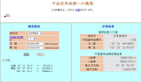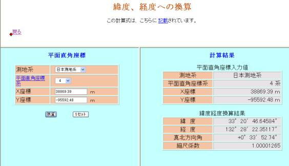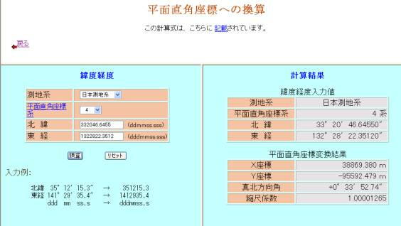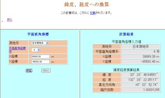 今度は明浜町記載の直角座標を使用して緯度・経度を計算してみる。