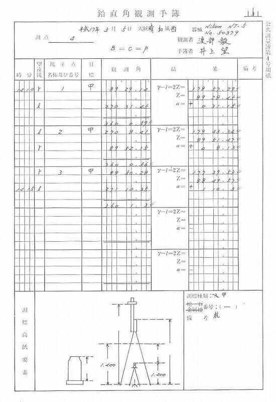 観測当日に電子基準点を利用してGPS観測を行ない、その成果値から内角と標石上での斜