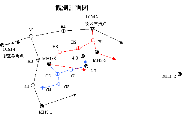 平成19年10月13日大洲支部研修(第31回勉強会)報告 研修計画 ![]() (この観側計画図は本説明のために3つの路線全部を概略で表示したものです) A路線は、街区三角点1004Aから方向角の取り付け用に今回座標を付け直したMH1-2を観測 して街区多角点10A14に至り1004Aを取り付け点とする1号路線、そして出発点は同じMH3-1に 至りMH1-2を取り付け点として観測する2号路線からなるY型の定型網です。 点間距離も50メートル以上あり、街区基準点を使用した最も実務的な路線であり網の形状と してもわかりやすいものです。 B路線は、街区三角点1004Aから方向角の取り付け用のMH1-2を観測して出発し、MH3-3 に至り方向角の取り付けでMH1-2を観測する1号路線。 出発点は同様でMH1-3に至り方向角の取り付けでMH1-2を観測する2号路線からなるY型 の定型網ですが、点間距離が30メートル間隔と短いため高度角の観測が難しい路線といえ ます。 C路線は、MH1-3からMH1-2を取り付け点として出発して、既存の四級基準点4-7に至り取り 付け点も既存の四級基準点4-8を観測する1号路線。 出発点は同様でMH3-1に至り、方向角の取り付けでMH1-2を観測する2号路線からなるY型 の定型網です。 途中に高いフェンスが存在し、TSを高く設置して観測しなくてはなりません。また、点間距離が 比較的短いので高低角観測が難しいと思われます。 研修当日 1時間前から準備にとりかかり、各班の観測の共通の方向角の取り付け点となるMH1-2の位 置に三脚を据え付け、整準台の上にGPS用の1メートルポールを設置。 本日の各班の観測点に間違いのないように、地面にペンキで測点名を表示しておいた。 30分前には測量屋さんが、15分前には参加者のほとんどが揃ったのですが、いつもなら1時 間以上前に準備をしている迷惑おっさんがいない。 「周りの三角点を確認してるんだろう。」 本日の研修の役割分担で、迷惑おっさんが手簿を用意してくるとの事であった、本日の観測 の前に事前に手簿を渡し各自で準備をしてもらわなければならない。 前回の研修の残部とコピーを失敗した分しか私の車には積んでいない。とりあえず手簿を参 加者に配布する必要があり、不足分を法務局にコピーをお願いすることにした。 コピーが出来上がっても、迷惑おっさんがまだ来ない。 とりあえず出来上がった手簿を参加者に配布する。 (この時、あわてて参加者に配布したため、水平角観測手簿と距離観測手簿のコピーが左右 反対になっているものが混じってしまいました。参加者の皆様すいません。) 参加者に用意していた観測計画図を渡し、これから自分の観測する路線の下見を行ってもら う。 迷惑おっさんの習性を知っている講師達は気にも止めていなかったが、さすがに5分前になる と、心配になり携帯電話に連絡を入れても通じない。 「何か、あったんと違うか。」と心配になった時 「あっ、こられました」と測量屋さんの声。 集合場所の大洲支局の駐車場に迷惑おっさんの車がやってくる。 「ずっと前を60キロの車が走っていて。」 今治からの高速道路が思うように走れなかったらしいのだが、実は1時間寝過ごしてしまった らしい。 観測前に 実務の路線に最も近いと思われるAコースを観測する地元の調査士4人をA班。 基準点測量に目覚め、ずっと研修に参加していただいている宇都宮さんと補助者の二宮さん と、私の補助者そして迷惑おっさんのB班。 法務局敷地内を観測するが、フェンス越しに観測する必要から、TSを高く設置しなければなら ず観測に技術を要する法務局から参加の3人に西さんと野本さんをC班にと班分けを行った。 観測場所の重複を避けるためA班は街区三角点1004Aから、B班はMH3-3から、C班は MH1-3から観測を開始することとした。 気象補正として気温25度、気圧1013ヘクトパスカルを入力するように指示する。 観測については、倍角差30秒、観測差20秒、高度定数の較差30秒を制限として、これを越え る場合は再測量すること。 距離観測については観測計画図に記載の方向からの1方向からの距離観測とする。 手簿への記載はボールペンで行うこと。 観測者と手簿者については各自交代しながら1点1観測で観測を進め、全路線の往路の観測 が出来れば、今度は逆向きに観測者・手簿者を交代して復路の観測を行うこと、各班の実際の 観測データにより、計算を行うので12時までには最低でも往路の観測を終了させること。 観測開始 午前9時、各班は観測開始点に別れて観測を開始する。 A班スタート 街区三角点1004Aから観測を開始するA班。 交差する道路に渡る小さな川のコンクリート橋のコンクリート基礎部分に街区三角点1004Aが ある。 見慣れたキノコ型をした真鍮鋲ではなく、頭の部分が平坦になっている。 キノコ型の真鍮鋲では十字の刻印が削り取られているようになっているものが多かったが、こ の形であればそのような事は少ないだろう。 亡失せず、いつまでも良好な状態のままであってほしい。 さて、観測しているA班の二宮氏は、本日のために器械を