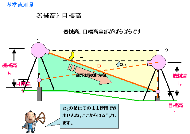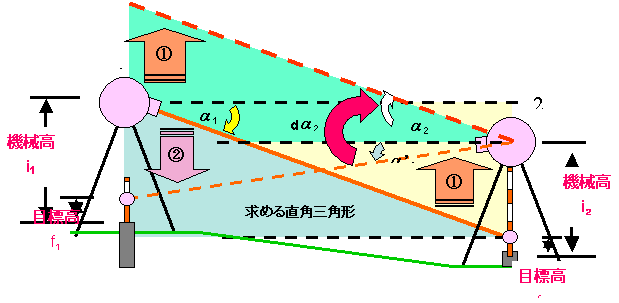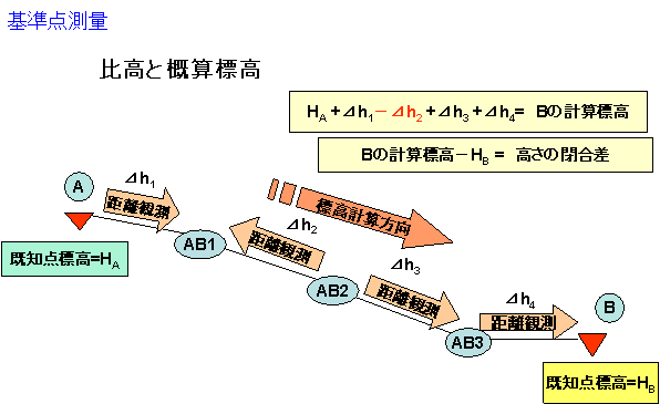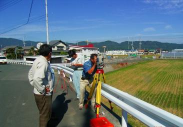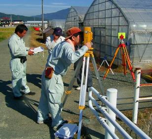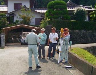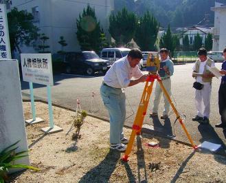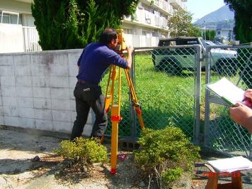 B班スタート MH3-3もMH1-3と同様に、今回の研修のためにGPS観測により再計算を行っています。 B班はここからMH1-2を取り付け点として観測を開始しますが、MH3-3からMH1-2は中間にあ る電線が邪魔をしている。 迷惑おっさんが器械の高さを調整して、MH1-2に立てたポールがみえるようにして観測してい ます。 三脚はガードレールをまたいで据え付けることになり、このような場所での器械の据付には慣 れが必要です。 慣れてしまうと、案外安全で好んでこのような場所に選点したりしますが、ガードレールをまた いでの観測となるため股下の長さに自信がない方は選点しない方が・・。 ![]() C班スタート 法務局職員主体のC班はMH1-3から観測開始です。 MH1-3は、以前測量研修のため松山法務局大洲支局内に電子基準点を使用して設置しまし た。 設置当時は1級基準点相当ということにしていましたが、今回は街区基準点を与点として再計 算を行ったので、3級基準点相当に格落ちになってしまいました。 座標値と標高の成果とも1センチ以内の変更だったのですが、これが後で問題になるとは誰 も知らない。 ![]() 地面に三脚を思い切り踏み込むのですが、なかなか求心が合いません。 三脚の脚頭から器械がはみ出しています。 それじゃあ、もう一回。 「う〜んっ。」 どうやら、求心して踏み込んだ後、円形気泡管の気泡により三脚の脚を伸縮させて調整して いるのですが、その時3本全部を動かしているためなかなか定まらないようです。 最初に三脚の長さを揃えた後、微動ねじの位置を真ん中の状態で求心して踏み込み、その 後、三脚の脚二つを使用して調節すれば、そんなに移動しないのですが・・。 C1の位置からは3方向の観測です。 ![]() しかも、フェンス越しの観測のため足元にブロックを置き、それに乗って観測することになりま す。どうしても高度角補正計算が必要になる場所です。 観測もいつもの高さと相違するだけで、ずいぶんと勝手が違い難しく感じます。 もう少しだ、頑張れ 気温は観測を開始した9時に25度あり、昼前には30度近くとなり、陽炎の影響もかなりのもの になっています。 正午丁度の観測となったMH3-1の地点の観測、MH1-2への観測は建物の屋根の上を視通す ることになり、かなり陽炎の影響を受けます。 足場も悪い。 実は、この10分前までワゴン車が止まっており、背伸びをして観測しなければ不可能と思われ ましたが、運良く車が移動してくれ観測を開始することが出来るようになりました。 ![]() B班が帰ってこない 同じ頃、観測が順調に進んでいるB班が最終地点の大洲支局敷地内にあるMH1-3に帰って こない。 先ほど見回った時には、1つ前のB3地点で観測を行っていた。 12時前にすべての観測が終了するだろうと思っていたのだが、帰ってこない。 そこへ、井上君が「1つ点を間違えて観測したので遅くなりました。」と言いながらMH1-3に反 射板を据付始めた。 選点の時に、B3とMH1-3の間に、コンクリート舗装の位置に調査士会と表示された真新しい 座にステンレス鋲が打ち込まれ、白いスプレーで1と表示されていた。 選点した時に冗談で「この鋲を使用しようか、間違うかもしれないね。」と言いつつ、民地への 侵入路の位置であったので、10mほど横の位置の道路にプラスチック杭を打ち、その上に鋲を 設置してB3として表示していた。 どうやら、迷惑おっさんが、朝ぎりぎりの参加だったため満足に下見をすることが出来ず、次 の観測点を探した時に近くにあった鋲の位置をC3と間違えて立てたらしい。 そのため1つ余分に観測することになり、遅くなってしまったらしい。 これが幸いしたのか、B班の観測の終了も12時10分頃となり、1つ観測点が少なかった路線も 新点4点となり他の班と同一の条件となった。 各班とも2、3回再測量を実施したようですが、12時30分にはA、C班とも1通りの観測がすべて 終了しました。 残念ながら復路まで観測が終了した班は無かったようです。 観測結果 午後1時30分、昼食後 会議室をお借りして手簿の整理を行う。 各自手分けをして一つ班の観測点全部を網羅し、計算が出来るように整理し、チェックを行い ます。 観測差・倍角差そして高度定数の較差のチェック、中数、高度角を関数電卓で計算し、チェッ クを入れていきます。 ここでも慣れている班と慣れていない班の差が出てきます。 今のところ、手簿のチェックで必要になった再測量はありません。 2時過ぎ、基準点測量研修にいつも参加しているB班のメンバーはチェックを完了したようです。 ![]() 計算要素図の作成 手簿のチェックが完了したところで、各班に配布したA3判の観測計画図を利用して、計算要 素図を作成していきます。 「えっ、全部書き込むんですか。最初から作らんといかんの。ありゃ下絵を全部準備してもらっ て数字だけ入れたらいいと思ってたのに。」 研修会参加2度目のA氏の悲鳴にも似た声が上がる。 確かに前回の研修は、計算要素図の矢印等を記載した下絵を配布し、手簿か