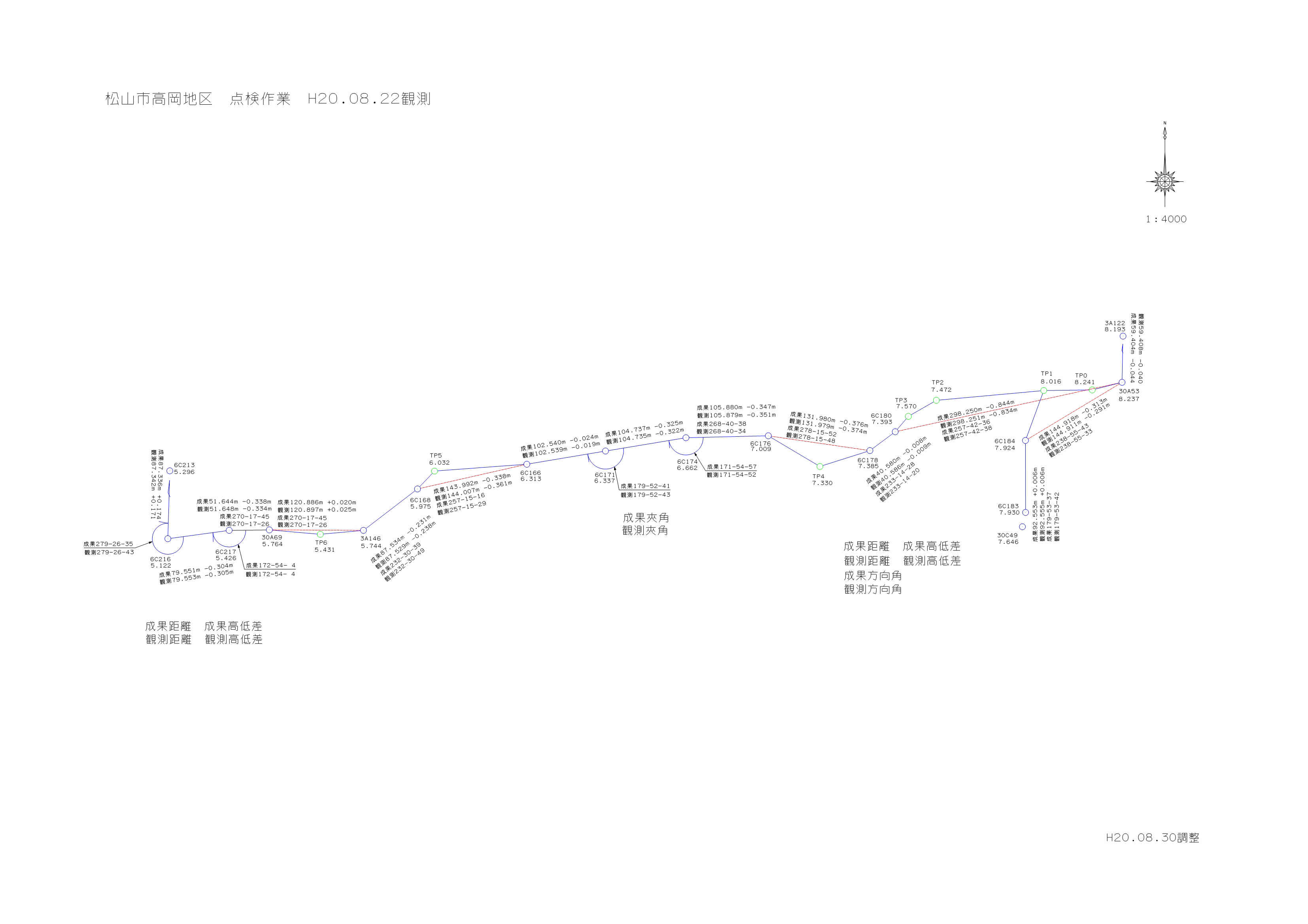 高岡町基準点設置作業 2 (TSによる与点チェック) 平成20年8月22日(金)、調査士会館集合 本日はTSでの観測である。 与点の点検と参加者の研修でもある。 以前、昭和62年に実施された鷹子14条地図地区の図根多角点を平成14年に検証した時 迷惑おっさんは外周が一番大事だと言っていた。 本日は高岡地区の南側の外周に設けられている街区基準点の測量で、観測点数は18点 から20点の予定である。 街区多角点節点・街区補助点 高岡町の南側を走るバス路線に沿って、基準点を観測していく。 このバス路線は交通量も多い道路であるが、狭い場所は道幅が3m50程度しかない。 バス等の大型車が通る際には、対向車は幅の広い場所で停車して待っている。 その道路に街区多角点、節点、補助点が点在している。 街区多角点の材質は街区三角点と同様に真鍮製、形はきのこ型で頭の部分が平たく なっており、一回り小さい直径5センチである。 街区多角点節点は直径5pのアルミ製の座、街区補助点は4pのアルミ製の座で国土 交通省、都市再生街区基本調査と刻印してある。 ![]() 街区多角点補助点 時折、アスファルト舗装に打ち込まれているものもあるが、多くはコンクリート構造物に しっかりと設置されている。 今回観測しようとしているバス路線の範囲では、設置してある15点の街区多角点・節点・ 補助点だけを使用してバス路線全体を連続して視通する事は出来ない。 そのため、視通の出来ない場所には任意の観測点を新設し、新設観測点からお互いの 視通が出来ない基準点を観測することにより、基準点間の距離・高さ更には観測夾角を 計算して、その成果値との比較で与点の精度確認をするものである。 当然、基準点間で視通の出来る場合は観測数値と直接比較することになる。 観 測 観測にあたっては、実際の図根多角点観測と同様に4級基準点測量の要領で水平角は 2対回観測、鉛直角観測は1対回、距離の観測は斜距離1セット、2回の観測である。 研修の為、各自持参のTSを使用しての観測で、手簿は手書きで行われた。 本日は調査士会会長O田さんも補助者のK谷さんと2人の参加である。 過去の基準点測量の研修で基準点測量の権威であるS方先生から「良い観測屋になれる」と 言われ観測には自信を持っているようである。 「ただし、実際はほめ言葉ではなく、観測だけは出来るという意味らしいんですけれどね。」 自分自身の欠点もしっかりと理解している。 4月から実施されている街区基準点測量についても測量屋さんに相談しながら堅実に実施さ れているようである。 各自持参したTSを使用しての観測であり、2人一組となった4組が一斉に観測を開始した。 実際の図根多角点測量と同様に器械高については任意の高さとし、目標高も任意高で 出来るだけ低く設置することになる。 同時に観測をするため、自分のTSを据え付けた観測点には、相手方の観測の為に ミニプリズムがいつものように設置される。 観測が終了すると、4つ前の観測点に向かい移動していく。 どんどん観測は進み、13時頃にはすべての観測が終了した。 内 業 観測終了後、調査士会館に集合。 観測結果を整理。 バス路線全体を4つの路線に区切り、路線別に各自が計算を受け持ち関数電卓をひたすら 叩いていく。 街区基準点測量の為の研修に何回も参加した者ばかりであり、手計算にも皆抵抗は無い。 平均ジオイド高、縮尺係数、与点の座標と標高を確認しながら計算は進み、高度角補正計算 概算標高の計算、球面距離、平面距離、近似座標計算をすべて計算していく。 午後4時ごろには、バス路線すべての計算が終了し、良好な結果が得られた。 ![]() 与点の点検作業計画図 ![]() 与点の点検作業結果 |