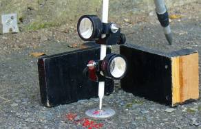 高岡町基準点設置作業 7 ( 図根多角点観測開始 ) 平成20年10月10日、午前8時調査士会館駐車場集合。 本日より、高岡町法14条地図作成のための図根多角点観測本番である。 与点を含み4級基準点相当の約400点の図根多角点観測が開始される。 たこ部屋組織表 「たこ部屋」の組織編制は現場監督、迷惑おっさん。 観測手は測量屋さん、N本さん。 観測の補助記録係として、それぞれにS松さん、K谷さん。 写真で「点の記」を作製するため、図根多角点の写真撮影係に踊る調査士の荻やん。 プリズム設置係兼障害物対策係はM好さん、T永さん、K石さん、老眼おっさんである。 測量器械は、TS2台、木製三脚3脚、ターゲット2組、金属三脚1脚、ピンポール7本、ミニ プリズム7個、ピンポール用三脚7本である。 二つのTSは観測にあたり、なるべく隣接した場所で観測することとし、観測方向数をプリ ズム係が判断して、不足する場所には余っているプリズム係が対応することになっている。 1日あたりの観測目標数は2つのTSで50点であり、TSの観測に8日間要することになる。 観測の目標物 今回の図根多角点観測にあたっては、目標物を正確に観測するということを目標としている。 迷惑おっさんの拘りは、準備段階の器械の点検から始まり、半端では無い。 視準をするにあたっても、図根多角点の位置を正確に観測しようと色々と考えている。 準備段階で解ったように近距離の観測においては、ピンポールとミニプリズムを利用し、ミニ プリズムの高さを上げずに観測した方が鉛直角、水平角の観測は正確である事。 高さの位置(ミニプリズムの高さ)のコンベックスによる測定においても、ある一定の位置を 決めていた方が正確である事。 鋲の十字とピンポールの一番下がわかるようにピンポールの石突の種類を先の細くとがった ものを利用することとした。 ピンポールの石突部分については各種販売されている。 今回使用される、先端部分が細く長いものについては先端部分が細いためすぐに曲がって しまう欠点がある。 迷惑おっさんから、そのことに注意して取り扱うように説明がある。 また、石突の先が鋲の十字の切れ目に入り込む距離を2oと計算し、 石突とピンポールの 境目にミニプリズムの一番下端を合わせることとしたので、ミニプリズムの高さは、ミニプリズム の種類により原則76o、86o、98oの三種類となった。 また、迷惑おっさん、石突の先が良く見えるようにと石突部分を白くペンキで塗り、更に観測時 には石突部分が良く見えるようにと、迷惑4次元ポケットから黒く塗ったついたてを取り出した。 これは石突の後ろに設置するが観測時の状況により、ついたての反対側の白い部分も背景 とすることも出来る。 迷惑おっさんの4級基準点測量経験から生まれた知恵である。 簡単で何でも無いようだが、経験が無ければ思いつかない。 後日、迷惑おっさんは石突を白くペンキで塗った事によりミニプリズムの落下防止にもなった と自慢しているが、たまたまそうなっただけだと老眼おっさんは思う。 ![]() 白く塗られた石突と衝立 設置風景 ターゲットの高さ ターゲットについては、先日の器械点検によりK石さんと、T永さんのターゲット2つを使用する ことになった。 ターゲットの高さについては、斜距離を測定後、ターゲット板の横幅の半分の距離との関係に よりピタゴラスの定理で高さを算出する。 計測した斜距離に応じて1oか2oを差し引くこととした。 すいません 観測は、T4067、T4045からそれぞれ開始された。 それぞれの観測開始場所は相手の目標となる図根多角点の場所でもあるたち、自分のTSの 足元にはピンポールとミニプリズムのセットが相手の方向に向けて設置される。 相手に向かい、自分の位置のミニプリズムの高さを相手の観測補助係に伝え、補助係は データコレクターに高さを入力するとともに、後日の計算チェックのために観測控えにも記録して いく。 ミニプリズムがTSに正対していないと正確な観測にならない。 観測手から「すいません。もう少し右に向けて、上に向けてください」と申し訳なさそうに指示が 出る。 ターゲットと違って、ミニプリズムは、プリズム位置と人間の眼の高さ、位置が相違するため ピシッと正対させることはなかなか難しい。 測量屋さんとN本さん、過去の法14条地図(新浜・高浜、御幸、道後地区)の基準点でも 観測を行っている。 測量屋さん、朝一番の観測でなかなか調子が出ない。 「すいません。再測です。」手を挙げ、申し訳なさそうに測量屋さんが、再測量を開始した。 7分後、3方向の観測は終了した。 (実は、測量屋さん、本日の準備のため前夜遅くまで図根多角点の番号付けの作業をしてい たらしく、本調子でなかったらしい。) 観測の段取り TSのもう一方の観測手、N本さんは3方向、4方向の観測が続くが再測量も無く、観測は順調 のようだ。 空とぶ調査士、M好さん、観測順番を迷惑おっさんに尋ねながら、手際よくターゲットを次の 観測地点に