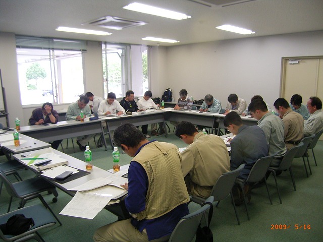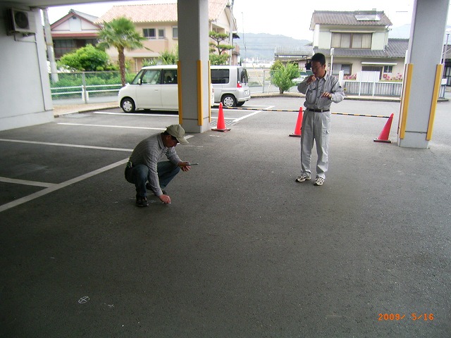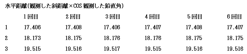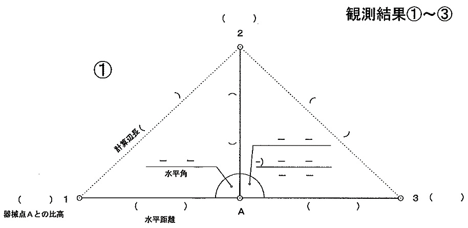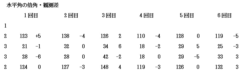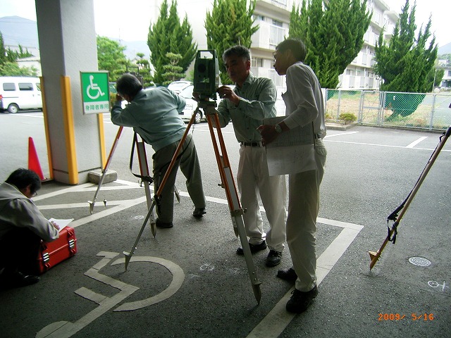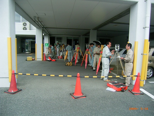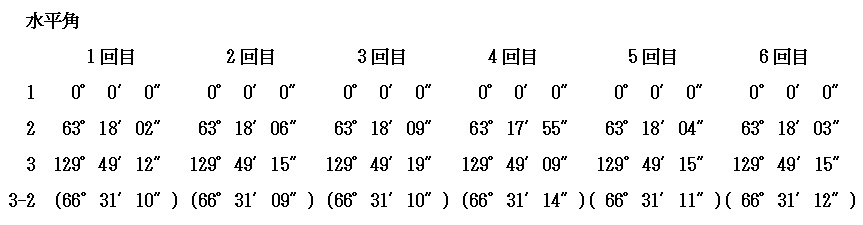 大洲支部測量研修会1 (平成21年5月16日) ( 観測 ) 観測準備 午前8時20分松山地方法務局大洲支局に到着、すでに講師の渡部今治支部長 (以下渡部氏という)が支局のピロッティで何やら準備をしている。 ![]() 黙々と準備をする渡部氏 挨拶をしながら近づくと、地面にチョークで印をしている。 「何を企んどん。」 いつも、研修会が開始されるまで種明かしをしてくれない。 それでも、参加者に対しては内容を知らないとは言えず、開始されると一気 にその方向性について理解しなければならない。 研修が開始されて思わずニャッとする場合もあるが 「えっ何、おいおいちょっと待ってよ、これはまずいぞ、うかうかしていると全く 分からないぞ」と思わされる事が多い。 内容を理解出来ず、段取りが悪いと「このくらいは知っていると思ったのに」と あっさり言われてしまう。 研修企画者にとってはいつも悩みの種である。 『趣味は測量、しかも役に立たない事を考える事』と渡部氏は言っているが 彼の本当の趣味は『講師面をした偉そうな助手をうろうろさせていじめること』 ではないかと私は密かに思っている。 今回もどうやらその趣味にまんまとはまってしまいそうになっている。 おかげでここ最近頭の毛が・・・。 渡部氏、私にはお構いなしにチョークからやや離れた位置にトンカチで鋲を 打ち込んでいる。 午前9時になり、参加者はすべて揃った。 会議室に入り、今から開始することの説明が始まる。 ここで真面目に聞いておかなければ、渡部氏から一日中馬鹿にされてまうこ とになる。 本日の手順については、参加者には全て承知しているような顔をしながら 渡部氏の説明に聴き耳を立て対応する。 黒板に書かれた観測計画図 ![]() (ピンポールに3つのミラー表示は原稿での説明が容易なように筆者が追加 で図示した) 観測については、Aと表示された赤丸のピロッティの場所(鋲の打ち込まれた 9つの位置)で二人一組により観測手、手簿者を交代しながら1、2、3の3方向 について観測を行う。 観測場所については最初に選んだAの場所を固定した場所としての観測であ り移動はしない。 水平角2対回、鉛直角1対回、斜距離観測であること。 その場所で1回観測が完了すればTSを箱に戻し、最初の状態まで戻した後 観測手・手簿者が交代して、器械を再び据え付けして観測を行う。 一人の観測者が同じ場所で同じ目標を6回繰り返して観測することになり、最 終的には1箇所で12回TSの据付と観測を行うことの説明があった。 水平角と距離観測の手簿が手渡される。 ベテランと新人を組み合わせ、二人一組の班編成を決定。 観測の制限について「4級基準点相当の制限よ。」との返答があると思い 渡部氏に「今日の観測の制限は無いの。」と聞くと 「今回はありません。そのままで良いです。」との答えが返って来る。 あっ、これはきついと思ったが、今回私は観測に加わらなくても良いとのこと それだったらそれはそれで良いか。 やっと渡部氏の企んでいる事が分かったので、結果がちょっと楽しみになった。 観測開始 午前9時30分、大洲支局のピロッティに各自持参のTSがずらっと並ぶ。 TSの種類、三脚も木脚、金属脚といろいろあり壮観である。 ![]() 各自の観測位置から1,2,3の目標に障害の無いように設置されたAの位置 ![]() 求心のやり方もいろいろです レーザー・垂球・求心望遠鏡 参加者のTSが据付終われば、目標となる1、2、3の位置にピンポールを垂直 に立てる必要がある。 一本のピンポールに3個のミニ・ミラーを据え付けの為、ピンポールを垂直に 立てる。 野本氏は気を利かし、3の位置に三脚と整準台を据え付け、整準台の求心を 利用してピンポールを垂直に立てている。 これはいかん、遅れては渡部氏に「さっさと動いてよ。」と怒られてしまう。 2の位置に急ぐ。 徳永氏も雰囲気を察知したのか、1の位置で整準台を据え付けている。 ![]() 1、2、3の位置にそれぞれプリズムが設置されたのだが、TSと正対している かどうか確認しなければならない。 既に設置されているAの位置のTSに向かって、3つの班を1つのグループとし て上段・中段・下段のいずれかのプリズムを観測することとして、それぞれの班 にそのプリズムが正対しているか確認していく。 1つのグループの中のそれぞれの班に対しても丁寧に確認していく。 準備はすべて整った。 2対回観測 観測は3方向で水平角は0°、90°輪郭の2対回、鉛直角は1対回、距離は 斜距離の2回2セットである。 更に、観測開始にあたり、渡部氏から「本日の温度26度、気圧1020ヘクトパ スカルをTSに入力してください。1回毎の観測開始時間と終了時間については 手簿に必ず書いておいてください。」と注意がある。 観測が終了すれば、その都度三脚をたたみTSを箱に収納する。 観測手と手簿者は交代して改めて三脚を据え付けTSを設置して観測を行うと いう段取りである。 この作業を6回繰り返すということは、観測点を6点移動して観測するのと同様 であり、移