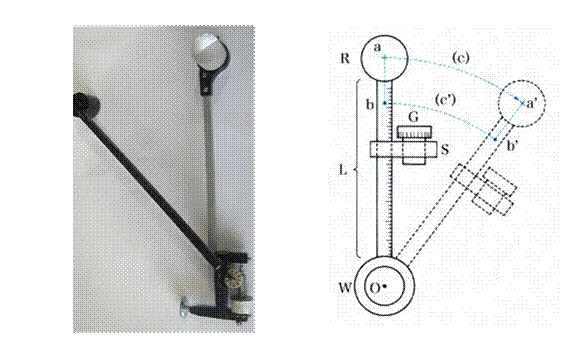 ∴ 同様に ABを@式に代入すると 制限は,一辺とこの辺に対する頂からの垂線の比が,2:1とされている。2:1ないと 三角形が偏平になり,各頂の交点が不明りょうになるからである。 (3)プラニメーター法 境界線が不整形な土地の求積には,シンプソン法を使用する方法のほか プラニメーターを用いる方法がある。プラニメーターは有極式と無極式がある。 (イ)有極式 1点を固定し,測針または指標で筆界線上を歩ませて面積を求める。 有極式には,定極式,円極式があるが,定極式が多く用いられている。 定極式プラニメーターには次の種類がある。 (a) 補正プラニメーター (b) 単式プラニメーター (c) 複式プラニメーター (ロ)無極式 固定する所がなく,平行な回転輪があり,細長い図形の面積を測定するのに適して いる。しかし有極式より高価で余り使用されない。 (ハ)面積測定 (a)面積測定可能の説明 プラニメーターで面積測定ができるのは,導針が図形輪郭を一周することに よって,測輪が回転する。この回転数によって面積の大きさがわかるが,鞘の 位置のとり方によって同じ面積を測定しても回転数は同じとは限らない。 したがって回転数だけでは,面積を表わすことはできないので,測輪の目盛 一目がどれだけの面積になるのかをきめる必要がある。これを単位面積といい 単位面積の値は図面の縮尺によって異なる 単位面積 mu…………………………………………………… A 目盛車はバーニヤを使用すると まで読めるので測輪の直径 ………………………… d 一目盛り大きさは ………………………………………… 導針と固定桿とのつなぎ目から鞘までの距離 ……………… l とすると,縮尺 a = 縮尺 a = 例えば縮尺 実際の単位面積が得られる。したがって縮尺と l の長さがきまれば単位面積 aがきまることになる。 上式を変形して l を求める式にすると l o= a =0.1p2 ,縮尺 l = a =10m2 ,縮尺 l = 間には一定の関係があることが解る。 単位面積 a,縮尺 ![]() 例えば縮尺 4式を用い となるので,これに近い値0.5m2とか0.6m2 にするには l の値を変えればよいから l = 鞘の位置を66.9mmの所にすればよい。