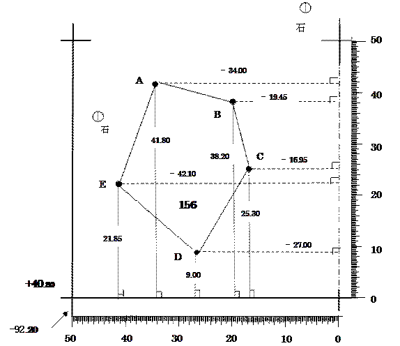 またY座標については,図郭内の交さ記号からマイナス方向に距離を読み取りました。読み取った距離は負の符号になりますので,Y軸の右側にある図郭内の交さ記号の座標値の値から読み取った距離を加えれば地籍調査上の座標になります。図のA位置については,この場合,左下図郭線上の図郭交さ記号の座標値をあらわすY座標-92200.00を使用せず,右側(東側)の図郭内の区郭交さ記号からの距離を使用します。これは図郭線上の図郭交さ記号から10pの位置にありますので1/500の縮尺の地図では50mの距離となり,-92200+50=-92150が東側の図郭線区郭交さ記号でのY座標ということになります。 この数値に対して読み取った距離を加えると,図のA位置については -92150+(-34.00)=-92184.00 となります。 以上の方法から X座標 Y座標 A 40,800 +41.80= 40841.80 -92,150+(-34.00)=-92184.00 B 40,800 +38.20= 40838.20 -92,150+(-19.45)=-92169.45 C 40,800 +25.30= 40825.30 -92,150+(-16.95)=-92166.95 D 40,800 + 9.00= 40809.00 -92,150+(-27.00)=-92177.00 E 40,800 +21.85= 40821.85 -92,150+(-42.10)=-92192.10 となります。 更に,この図面の中に表示のある石の図根多角点のↀの印についても読み取っておきましょう。この図根多角点は現実に観測され,成果として座標値を持っています。その座標値と読み取り値を比較することにより,地図上での位置が正しくプロットされているか,読み取りの座標に間違いはないか確認する事が出来ます。 この座標値を使用して,A,B,C,D,E,Aで結ばれる1筆地の面積を座標法により計算してみると513.8825uになりました。この面積を登記面積と比較することにより境界の座標が正しく読み取れているか,正しく読み取れているがどうも面積が相違するという場合もあります。後日の登記処理についての心構えも出来ます。 ●人間の眼ここで,ちょっと人間の眼の分解能について触れておく必要があると思います。人間の眼の能力は25p離れた場所で0.2oのものを識別出来るという事らしいのです。それではこのことをそのまま地図の読み取りに当てはめると,地図上の0.2oは1000分の1の図面ですと現地では20p,500分の1ですと10p以下のものは地図上からは人間の眼では判断出来ないという事になります。 地籍調査の図面上の境界線は大体0.1oの線で記載されているようですので,1000分の1で10p,500分の1では5p程度でしか識別出来ないというのが本当のようです。 したがって,ここでの読み取りについても,その程度でしか読み取る事が出来ないという事は良く理解しておいてほしいものです。 逆に考えれば,地図を作成する側のプロット出来る限界が解ります。 地図を復元する立場からすれば,これ以上追及する事の出来ない地図の精度・誤差範囲があるという事を知ることが出来ます。 ●同一の座標系(位相) そうこう言いながらも,埋石(図根多角点)と,地籍調査が測った1筆地の境界について同様の座標系(位相)に数字上はなります。 しかし,これは図面上だけの事であり,現実はそういう訳ではありません。片方の埋石については,当時の地籍調査であってもトランシットでトラバース測量が行われ,数値がその時点で提出されています。しかし1筆地は,その図根多角点に平板を据え,アリダードで角度を,テープで距離を観測し,その結果を直接平板にプロットしたものを,別の時期に,先程やっていただいた要領で,個人や役場が読み取りを行い,その数字を得たものだという事です。そういった事から,読み取りの座標値で境界をそのまま表わすと考えるのはいささか無理があると言えます。読み取りの値は,本来の境界を示す(探す)参考にはなりますが,実際の境界の座標値そのものではありません。ここでは,普通言われている公差がそのまま生じます。(地籍調査で,その1筆地を測った図根多角点がその土地を問題なく測れる状態で残っているという前提ですが。)つまり,読み取り値で復元出来た位置から公差の範囲の円を描いた場所に,本当の(地籍調査で測った)境界がありますよという事なのです。 したがって,境界を表わす本当の座標値は,もう一度,現地で確認をされた値と言う事が出来ます。