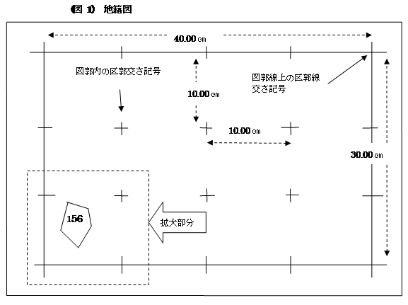 閉鎖された法14条第1項地図からの座標値の読み取り方法 現在の法14条第1項地図(以下法14条地図という。)は,地図管理システムからの地図の打ち出しになっています。これから説明する事はしっくりこないかもしれませんが,閉鎖された法14条第1項地図(以下地籍図14条地図という。)で簡単に確認出来ることですので,試してみてください。 ●読み取り方 読み取り方については,皆さんプラニメーターやデジタライザーをお持ちですので,今更説明する必要はないと思いますが,ちょっとおさらいのつもりで聞いて下さい。 地籍図14条地図の様式を今回の読み取りに必要な部分だけ簡単に下記に記載しました。本来,一番外枠の図郭線を使用して,読み取るのが一番正確です。境界点から図郭線までの垂線を下ろし,その垂線の距離を計測してください。我々調査士の対処するのは1筆地ですので,その1筆地を囲む形になる図郭内の図郭線交さ記号(トンボ)を使用して読み取る方法が一般的でしょう。
