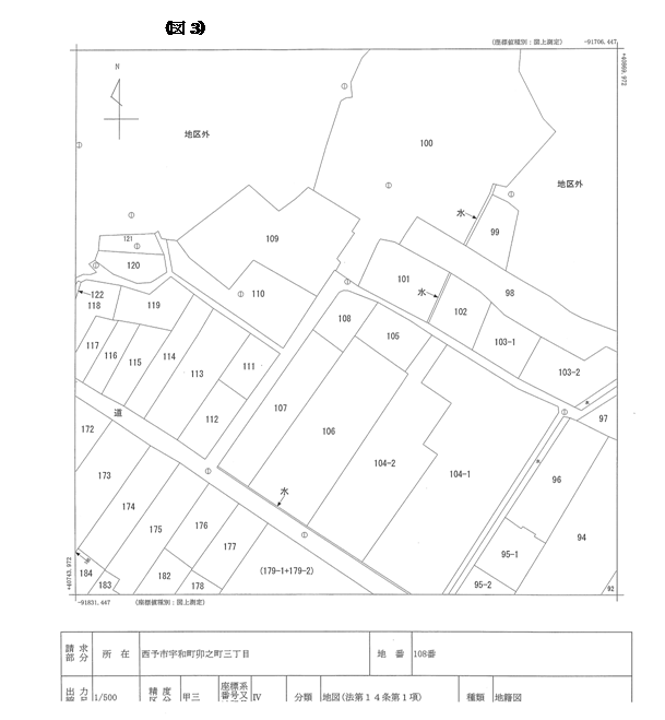 ●新法14条地図での読み取り (図3)は現在の法第14条地図ですが,地籍図14条地図と比較すると,図郭線については300o×400oの枠線でしたが,現在の法14条地図はA3判の用紙に合うように252o×250oの枠線のようです。どちらも右上と左下に図郭線の座標値が表示されています。 しかし,その座標値の表示は(図1)の左下の座標値は40.80と-92.20のq表示に対し,(図3)の表示は+40743.972と-91831.447のm表示になり,桁数に相違があります。 法14条地図は地籍図14条地図となった後,測量法の改正にともない日本測地系(旧測地系)から世界測地系(新測地系)へと変更された為,TKY2JGDによりパラメーター変換されました。先ほどのX座標+40.20qは+40200.000として+41179.191,Y座標-92.20q は-92200.000として-92440.501に変換されています。これは地図を測り直して精度が良くなっている訳ではなく,単純に同一位置の座標値が旧測地系から新測地系ではどのように表示されるか変換しただけです。 読み取りの内容については先ほどからの説明と変わるものではありませんし,作図をする過程に遡って処理を行った訳でもありませんので注意が必要です。 視覚的なものを数値に直したとしても,数値化した事により以降の劣化は免れますが,その時点で視覚から得られる多くの情報を逃した事も事実です。 また,地図の作成からの数値化であれば,数値地図としての値ですが,成果品が図解法により納められ,その成果品を改めて数値化したものは便宜的なものにすぎず,地図の精度が図解法の成果品より下がる事はあっても上がる事はありません。 分解能の精度が高いものを使用していると思いますが,図解法の成果品として出来あがったもの自体が5p単位を範囲とするものである以上,それをいくら性能の良い機械で読み取ってo単位で表示されていても,5p単位の範囲の精度以上のものではないのです。 新たな法14条地図から,先ほど説明した方法で読み取りを行っても問題はありません。隣接する図郭内の区郭交さ記号がありませんので,図郭線上の区郭交さ記号を使用しての読み取りとなります。読み取りの方法は地籍図14条地図と同様の理屈になります。 スキャナー等で読み取る場合もあるでしょうが,分解能がいくら良くても一度作成された地図以上の精度にはならない事は理解すべきです。 この新しい法14条地図ではↀの印はありますが,その下の石の表示がありません。 また,地籍図14条地図では,図郭枠付近の1筆地は図郭枠により分属されていますが,現在の法14条地図ではシームレスになっています。 また,地籍図14条地図をスキャナーで読み取る作業を行って現在の法14条地図としている為,その性質上0.3o以内は同一点として判断しているようです。その為地籍図14条地図で小さなガタとして表示されていたものが,同一点として判断され地図上から無くなっていたりしますので,地籍図14条地図(閉鎖された法14条地図)も調査しておく必要があります。