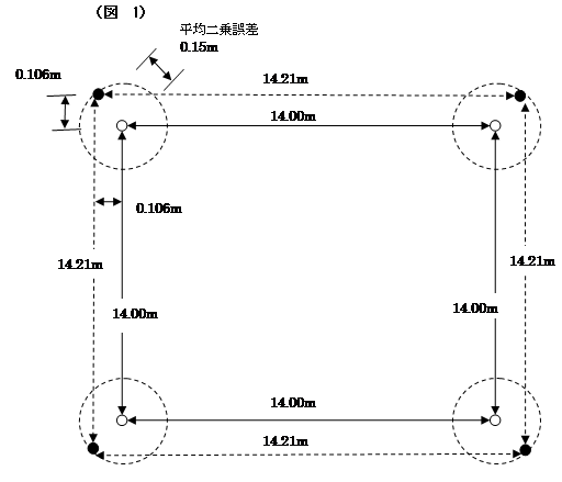 ここで,甲3の精度区分で考えてみましょう。まず4つの境界点について,四角形の本来の位置が土地の中心からすべて平均二乗誤差の15pの円の範囲にあり,4箇所全部で最大限外側に向いて相違する場合,正方形の辺長については14.21 mになります。