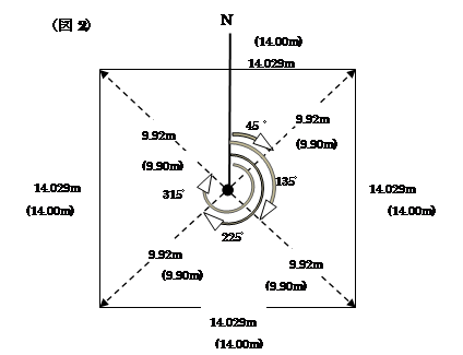 位置誤差,辺長誤差とも,これは十分すぎるほど各々の許容範囲内にはいっていますが,面積は14.21m×14.21m=201.92uとなり,登記簿の面積196.00uからするとその差は5.92uとなり,甲3の面積の公差2.448uを簡単に超えてしまいました。 公差の2.448uから逆算すると,この場合の辺長は13.91 mから14.09 mの間である必要があります。面積で公差範囲内であるためには,位置誤差,辺長誤差がすべて平均二乗誤差の範囲にあってもその公差範囲に入ることは難しいようです。 ●現実的な問題 図解法による地籍調査の場合,1筆地を観測し土地の形状を地図の縮尺により作成した後に,その結果の図形をプラニメーターで読み取り,右回り・左回りで計測を行い,その平均が最終的な面積になっています。1筆地の観測,地図の作成までと図形から面積を計算する過程は相当高度化しているようです。 面積の許容誤差は面積の算定時に同一の図形から読み取りを行う,プラ二メーターによる面積測定の技術の為の誤差と考える方が本当なのかもしれません。 ちなみに,プラニメーターによる面積測定については,精度が悪いとされ,ずいぶん以前から地籍調査でも使用されていないようです。 また,純粋に面積の差を考える時,時代の測量技術や測量機械に影響されます。地図作成時の測量器械と現在の通常用いる測量器械との差を考慮する必要が生じます。 ●測量器械による差 測量器械による差を少し考えてみましょう。同様の土地について,図解法による平板測量と現在のトータルスティションによる観測を単純に比較してみます。 条件として,この正方形の土地の真ん中(同一点で図根多角点と考える)に平板なりTSを据えて観測したとしましょう。 説明するにはTSで観測した状態から話をはじめたほうがわかりやすいと思いますので,TSで測った土地との比較をしてみます。この土地について水平角の観測については,北を後視点として45度,135度,225度,315度で水平距離がそれぞれ9.920mとします。そうすると辺長14.029m四方の正方形の面積196.81uの土地の形状が出来上がります。
