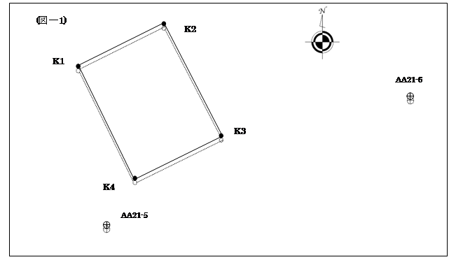 図根多角点のプロット誤差を考える (図根多角点のプロット誤差による境界点への影響) 既提出の地籍測量図の復元を行う場合,地積測量図に準拠点や基準点の記載があり,境界点にもすべて座標値の記載のある数値法によるものであれば,その位置にTSを据え付けて,地積測量図に記載された境界点の座標値を逆打ちすることにより,境界点の復元が簡単に出来ます。当然,基準点なり準拠点の点間距離や地積測量図に記載された境界点の不動標識と復元位置が一致しているかの点検は必要ですがそう迷う事なく,境界点の復元が出来ます。 地籍調査の場合,申請地を観測した図根多角点と後視点とした図根多角点が現地に残っていれば,境界点については法14条第1項地図や市町村の読取り座標を利用して,同様の復元をされていると思われます。 図解法による地籍調査の場合,図根多角点を観測して計算した後,平板にその座標値をプロットして,そのプロットされた位置を基にして境界点が観測され,結果的に平板上(座標平面上)に表示された境界位置の座標を読み取る事で境界点の座標値を得ています。 現地に一筆地を観測した図根多角点が異動なく,残っている場合について考えてみます。 図根多角点AA21-5,AA21-6は本来,点線で表示されるべき位置なのですが,プロット誤差で実線表示の位置にプロットされてしまった。 その結果,実際の境界点の位置を平板で観測した際には,境界点K1,K2,K3,K4の境界は本来の点線の位置ではなく,実線の位置に表示されてしまいます。実線で表示されている境界点と図根多角点の位置関係と点線で表示されている境界点と図根多角点の位置関係は同じものですが,座標平面ではその表示されている位置が相違する事になります。これは,図根多角点のプロット誤差がそのまま境界点の位置に反映されたためです。