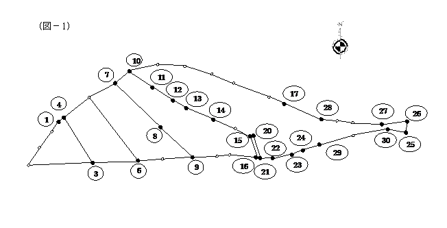 地図の縮尺は500分の1で(図−1)の形状を読み取っています。それぞれの境界点の読み取り座標値は(表−1)のとおりです。