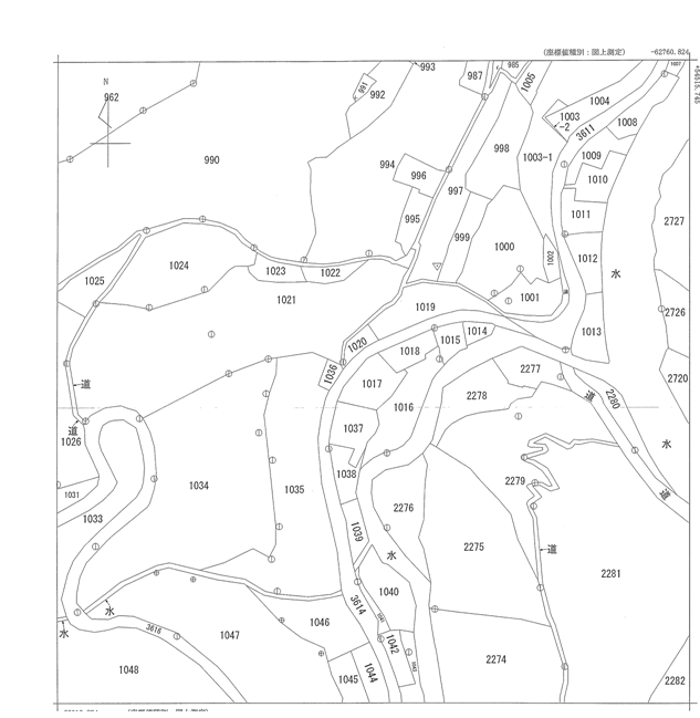 原図を読む 地図の切れ目付近に所在する一筆地が,何枚もの地図に分属している場合がありますが,法14条1項地図(以下法14条地図という。)では1筆地の形状がよほど大きくない限り,1枚の地図で表示されることになりました。このことにより,土地家屋調査士が分属表示自体を判断して,地図訂正が必要かどうか悩む事は無くなりました。 しかし,便利さの裏にはいつも大きな代償があります。 公図がマイラー化され,地図は見やすくなりましたが同時に色を失い,地図から得られる多くの情報を失ってしまいました。同様に,閉鎖された法14条地図(以下閉鎖14条地図という。)から法14条地図への移行で,すべての情報が移された訳でもありません。地籍図14条地図も,地籍図の原図では無く,副図なのです。地籍図原図からすると情報量のすべてを受け継いでいる訳ではありません。 そのため法14条地図は地籍図原図からすると,情報量が欠落しています。それはより専門性の高い情報です。 新人の土地家屋調査士が地籍図の原図を見る機会は,あまり無いように思われます。 地籍調査からの流れを上手に継続している市町村であれば,原図は職員の手によって,大切に保護されている事と思います。 逆に過去の地籍調査の資料の保管を負担に思っている市町村も少なくありません。地籍調査実施時から30年以上の時間が経過し,担当であるはずの職員でも,原図がどのようなものか知らない,その保管場所さえ知らない。ひどい場合には役所のどの部署が担当なのか不明という場合もあります。 原図は法務局に保管されている閉鎖14条地図そのものだと思われているかもしれません。また,市町村の国土調査担当課で,原図の閲覧を求めたところ「これが原図だ」と言われ,副図を見せられ納得された方もいるかもしれません。 閉鎖14条地図は原図では無く,原図が完成された時に1対1の特殊な写真撮影で正確に複写されたものですが,原図の情報を完全には複写してはいません。原図には原図のみが伝える情報があります。 (図1) は現在の法第14条地図です。閉鎖14条地図ではⒶとⒷの地図の2枚の地図で表示されていた部分の分属していた部分に線が入っていますが1枚の表示になっています。この部分でいろいろと比較してみたいと思います。 (図1) 法第14条第1項地図