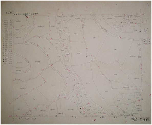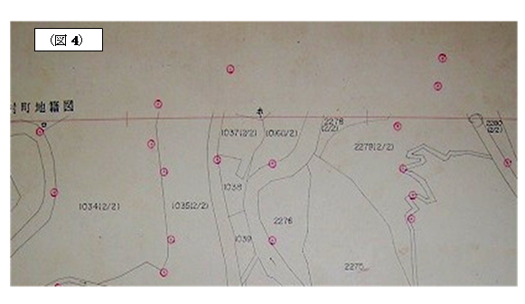 下図の(図2)は(図1)の法第14条第1項地図で表示されている接続部分の点線表示のある位置の南半分Ⓑの地籍図原図です。 現地に持参して測量をした鉛筆書きのアルミケント紙に墨入れし,整備・図面の体裁を完成させたものが原図で,それを改めて複写したものが副図と考えて良いと思います。 原図は現地に持参され,平板用紙として測量された結果なのです。その原図を眺めるだけで現地の情報が伝わってきます。原図には外側の図郭線,図郭内の区郭交さ記号(いわゆるトンボマーク),国家三角点の△印や,図根三角点の▽印,図根多角点を表すↀ印そしてその下の石の表示が赤色でそれぞれ表示されています。その現地でしか解らない情報を伝えようとしています。 図根多角点等についても,座標値により手作業でプロットされ,その位置に丸印が記載されています。 アルミケント紙には現地で平板測量の測量用紙として使用した為に,測量点には針の穴の跡があります。更には,墨入れをした後,土地の利害関係人からの申し出等により削って修正した跡もあります。修正した跡があれば,何等かの問題が地籍調査時にあったという事が解ります。 (図2)は原図を写真で縮小していますので,少し解りにくいかもしれません。 一筆の土地が2枚の地図にまたがる場合,閉鎖14条地図では分属して表示されることになります。コピーであれば,閉鎖14条地図でも,原図でも同様に見えます。しかし,原図をみれば測量針の跡を明確に見ることが出来ます。 この測量針の跡が大事な資料なのです。現場での野帳に匹敵する資料でしょう。図根多角点のↀ印の位置でも,○の真ん中に穴が開いていない事もあります。更に,コピーには表示されない削った跡や修正した線を見ることも出来ます。これは何らかの理由により修正された跡です。 また,分属している地図の両方に,共通する図根多角点の印が枠外に記載されています。 (図3)は(図2)原図北側部分に接続する,もう一枚のⒶの原図の接続部分を写真撮影し拡大したものです。 (図3)では,境界に測量針の跡が解ると思います。図郭線の枠外にも針の跡があります。地図が2枚にわたる場合,どこの図根多角点から観測したかという事が解ります。つまりどちらに記載されている境界点の位置が正しいのかということになります。 原図には,隠された事実があります。地図訂正等の場合は地籍調査時に既に問題のあった場合も多く,原図を見る事により解明出来る場合もあります。 便利さだけを求めず,法14条地図だけでなく,閉鎖14条地図を必ず確認する。更に必要なら原図を見て,過去の事実を知る事も大切でしょう。