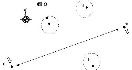 三斜法による測量図からの復元2 形状が明確でなく,面積計算に使用した数字からの復元 分筆申告書の図面のように,底辺や高さのみ記載されているが,縮尺が明確でなく,形状は手書きの見取り図的なものはどうしようも無いと諦められているようです。 そこで20年前,いや,30年前になるかもしれませんが,三斜法を利用していた当時に立ち返って,どのような計算や面積計算をしていたか頭のトレーニングがてら考えてみましょう。(図1)のような土地について,説明の都合上,屈曲点(境界点)に適当な記号a,b,c,d,eを付けて説明しますが,明確な位置という意味ではありません。 点cと点eの位置には,隣家との境界として昔から残る境界石がありますが,他の境界点a,b,dには何も無く,境界位置は不明です。