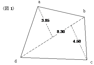 I1= そうすると辺acも同様に 三辺法(へロンの公式)で面積を確かめてみましょう。 s=(8.55+7.30+6.30)/2=11.075 三斜法による面積が22.44375ですから,ほぼ一致しているといって良いでしょう。 今度は(図5)のようにして,区分三角形㋑で考えると,先ほどの区分三角形㋐単独で考えた時と同様です。そこで他に利用出来る条件がないか探すと,三角形㋒で辺dbについて距離7.15mが記載されています。 先ほどと同様にして,三角形㋑の辺adを求める事にします。 ここでもピタゴラスの定理を利用します。@の位置からbの位置までをx1とすると, I1= そうすると辺adも同様に から, s=(7.30+7.15+4.89)× 1/2=9.670 区分三角形㋑の三斜法による面積が16.6075ですから,区分三角形㋐と同程度の誤差ですので,一致しているといって良いでしょう。