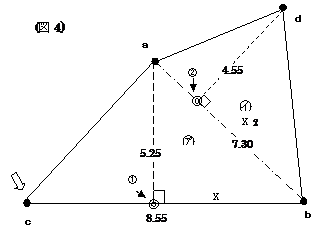 現地のa,b,dとされる位置には何も無く不明です。そこでcの位置を中心にして,それぞれの境界点a,b,dの位置を明確にすることを考えていきます。三角形の三辺全部の距離が明確になれば,位置の特定は出来るのではないでしょうか。 まずは境界点cのある区分三角形㋐ から考えていきます。 ㋐の単独の面積は (8.55 × 5.25)× ½= 22.44375 です。 点cの位置から,点bの位置は8.55mの位置,点aの位置は底辺cbに対して,直角に5.25m離れた位置ということだけは解りますが,それ以上のことは残念ながらわかりません。縮尺どおりに作成された地積測量図であれば,その地積測量図から辺acと辺abの距離を測りだせば良いことになりますが,ここでは,距離を測り出すことも出来ません。 そこで,(図4)のように隣の区分三角形㋑との組み合わせで考えます。区分三角形㋐,㋑を組み合わせて考えると,区分三角形㋐の辺abの距離が7.30mとなっています。区分三角形㋐においては,2辺が明確になりました。辺acが解ればこの区分三角形で表示されている位置関係が解ることになります。高さ5.25mと表示されています。境界点aから底辺cbに対しての垂線が5.25mということになります。 ここで,点a,点dから垂線を下ろした交点をそれぞれ@Aとし,点bから@までの距離をX1,点bからAまでの距離をX2とします。区分三角形は高さを共有した直角三角形2つが一緒になったものですから,