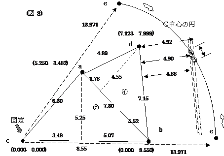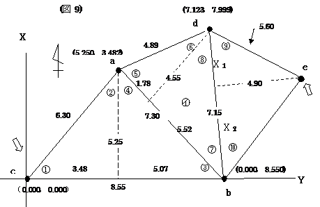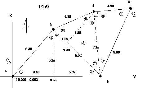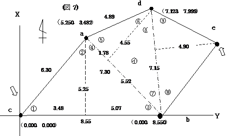 区分三角形㋐と区分三角形㋑で示された境界の位置関係については,大体が解りました,最後の区分三角形㋒はそれ自体が直角三角形になっています。 辺ebは (図5)において,点cの位置を(0.000,0.000)とします。(図5)には@からIまでの必要な角度がありますが,それらの角度が解れば,区分三角形の辺長の距離は解っていますので,それぞれの点a,点d,点bそして点eの座標値を求めることが出来るのではないでしょうか。 そこで点cを原点(0.000,0.000)として,区分三角形の㋐の底辺である辺cbをY軸と同一と仮定すれば座標平面が出来あがります。 @は @=sin-1(5.25/6.30)で@は56°26′33.68″となり,56°26′34″です。 Aは90°−@で33°33′26″です。 Bは B=sin-1(5.25/7.30)でBは45°59′11.99″となり,45°59′12″です。 Cは90°−Bで44°00′48″です。 Dは D=sin-1(4.55/4.89)でDは68°30′29.71″となり,68°30′30″です。 Eは90°−Dですので,21°29′30″です。 Fは F=sin-1(4.55/7.15)でFは39°31′16.31″となり,39°31′16″です。 Gは90°−Fで,50°28′44″です。 Hの角度は90°です。 Iは I=tan-1(4.90/7.15)でIは34°25′24.29″となり,34°25′24″です。 Jは90°−Iで55°34′36″です。 ここで, @=56°26′34″ A+C+D=33°33′26″+44°00′48″+68°30′30″=146°04′44″ E+G+H=21°29′30″+50°28′44″+90°0′0″ =161°58′14″ B+F+I=45°59′12″+39°31′16″+34°25′24″=119°55′52″ J=55°34′36″ 5角形cadebの内角の和は 56°26′34″+146°04′44″+161°58′14″+119°55′52″+55°34′36″ =540°0′0″ となり,計算に間違いはないようです。 点cの座標値を(0.000,0.000)として,ここで方向角を求めます。 点dに向かって 点cでの方向角は 90°−56°26′34″= 33°33′26″ 点aでの方向角は 360°−(A+C+D)= 213°55′16″が観測角になりますので 33°33′26″+213°55′16″−180°= 67°28′42″ 点bでの方向角は 360°−(E+G+H)= 198°01′46″が観測角になりますので 67°28′42″+198°01′46″−180°= 85°30′28″ 点cから点aまでの距離は6.30m,点aから点dまでの距離は4.89m,点dから点eまでの距離は4.90mです。 そうすると点aの座標値は X=6.30×cos33°33′26″+ 0.000 = 5.250 Y=6.30×sin33°33′26″+ 0.000 = 3.482 点dの座標値は X=4.89×cos67°28′42″+ 5.250 = 7.123 Y=4.89×sin67°28′42″+ 3.482 = 7.999 となります。 点eの座標値は X=4.90×cos85°30′28″+ 7.123 = 7.507 Y=4.90×sin85°30′28″+ 7.999 = 12.884 となります。 点bに向かって 点cから点bへの方向角は 90°になり, 点bから点eに向かっての観測角は(B+F+I)=119°55′52″です。 点bでの方向角は 90°0′0″+119°55′52″−180°=29°55′52″です。 点cから点bに向かっての距離は8.55mです。点bから点eの距離は8.68mです。 そうすると点bの座標値は X=8.55×cos90°+0.000= 0.000 Y=8.55×sin90°+0.000= 8.550 点eの座標値は X=8.67×cos29°55′52″+0.000= 7.513 Y=8.67×sin29°55′52″+8.550=12.875 点eの座標値を両方から求めましたが, 点d経由で求めた座標値 (7.507,12.884) 点cからの距離 14.911m 点b経由で求めた座標値 (7.513,12.875) 点cからの距離 14.907m となりました。 どちらを使用するのか,現地に残る点cと点eの実測距離は14.919mでした。2つの値の算術平均値を使用するのか,いずれにしても復元という意味では満足出来るのではないでしょうか。 (イ)現地に残る点と測量図記載の数値を利用しての復元 それでは,点eの位置がこのような場合はどうすればよいのでしょうか。点cと点eは現地に残っており,その実測距離は13.971mでした。 ここからは,もうパソコンを利用しましょう。電卓で小難しい計算をするよりも,眼で見ながら画像で処理の出来るCADを利用します。先ほどの例と同様区分三角形㋐,㋑について,点a,b,c,dの座標値を求める事が出来ますので説明を省略します。そこでCAD上で点d(7.123,7.999),点b(0.000,8.550)を結ぶ辺dbに対して,高さの距離として表示されている4.90mの誤差範囲である4.88m,4.90m,4.92m幅の3本の平行線を引きます。 そうすると,4.88mから4.92mの平行線の間に半径13.971mの円の外周が15p程の距離で交叉しています。点eの位置と求積している土地との関係から,このあたりになるということが解ります。 そこで,高さの距離として記載されている4.90mの平行線と,半径13.971mの円との交点の座標値をCAD上で求めてみると(4.893,13.086)でした。 本来の点eの位置は(4.805,13.119)であり,現実には4.92mの平行線と13.731mの円の交わる位置(4.825,13.111)がほぼ正解となる場所でしたが,宝くじのようなもので,自分の判断で4.90m丁度の位置を選びましたので,結果的に0.09m程の位置誤差となりました。どの位置が正しいのか解らない訳ですから,ここは自分の決めた位置が正しいと思うしかありません。 これまでの条件に何かが追加されれば,これまでの過程の中で1p単位で組み合わせを変えながら試行錯誤してみれば,より正確なものになります。 (ウ)再び測量図の数値のみで復元する ここまできましたので,もし辺deの距離5.60mが記載されていたとしたら,どのようになったのでしょうか。(図6)の状態で辺deの距離5.60mの記載があったとして(図9)のようにして計算してみます。 I1= 参考までに辺Dは Hは H=sin-1(4.90/5.60)ですから Hの角度は61°02′41.91″となり,61°02′42″です。 ここで点dから点aを後視点