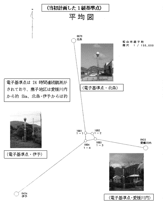 使用する電子基準点は北条・愛媛川内・伊予である。 国土交通省公共測量作業規程によれば 1級基準点測量においては、既知点を電子基準点(付属標を除く。)のみとすることができる。ただし、既知点とする電子基準点は、作業地域に最も近い2点以上を使用する。 観測距離が10kmを超える場合は、節点を設けるか、1級GPS測量機により120分以上の観測を行うとなっている。 公共測量作業規程1級基準点測量に準じて1級図根点測量を行うこととした。 観測時間はそれぞれの1級図根点で上空視界の測定を行い、新点位置の障害物、GPS衛星の飛来情報等を考慮し、不測の事態に対応するため充分の時間を予定した。 1級基準点4点、2級基準点1点(図根多角点B2)として計画を行なっていたが、1級図根点は下位の図根点に対して影響を与える。最良の結果を得るために机上での計画、更には実際の観測でも試行錯誤を重ねた。 その結果、当初の計画を変更し、1級図根点は5点(図根三角点B2を1級図根点とした。)となった。 4.3.1 GPS衛星の配置1級図根点測量に使用した受信機の取扱説明書には、二周波の静止測量は良好な条件下で30km以下の基線長による基準点測量等に使用可能で、この条件下の基線長精度は±5o+1ppm×基線長を上回るとある。 今回の最長距離は15kmであり測量は可能であった。 衛星の軌道情報をもとに時間を決め、観測を行い、測量計算を行なった。計算途中で気になる点があったが、制限内でもあったことから順次計算を行い、最終結果を得て一度は終了していた。 その後、鷹子地区以外でも電子基準点を使用してGPS測量を行ったものの何回か失敗を経験した。 その主な原因は上空視界とGPS衛星の片寄った配置によるものであった。 現在では27個のGPS衛星が運行し、常時4個以上の衛星が上空にあって測量が可能になっている。このことで何時でも測量できると思い込み、注意深く衛星の配置について考えることが欠けていた。 これまで経験したGPS観測は長くても観測距離が1km程度であったが、電子基準点を使用すると距離が数十倍も長くなる場合がある。 短距離ではある程度の計画を立てれば、満足できる結果が得られていたが、電子基準点のみを利用するような長距離では長時間の観測になる。その際には片寄った衛星配置にならないように、特に低い高度の衛星は予測の出来ない思わぬ障害が発生することがある。 事故の防止とともに細心の注意で観測計画を行なう必要のあることを実感した。 この経験により、鷹子地区について良好な結果を得るための測量について再度考えた。 衛星の配置 観測の時間帯・電離層が安定している冬の深夜。 2周波受信機の使用により、電離層遅延の補正ができるが、より安定した状態での観測を心掛けた。