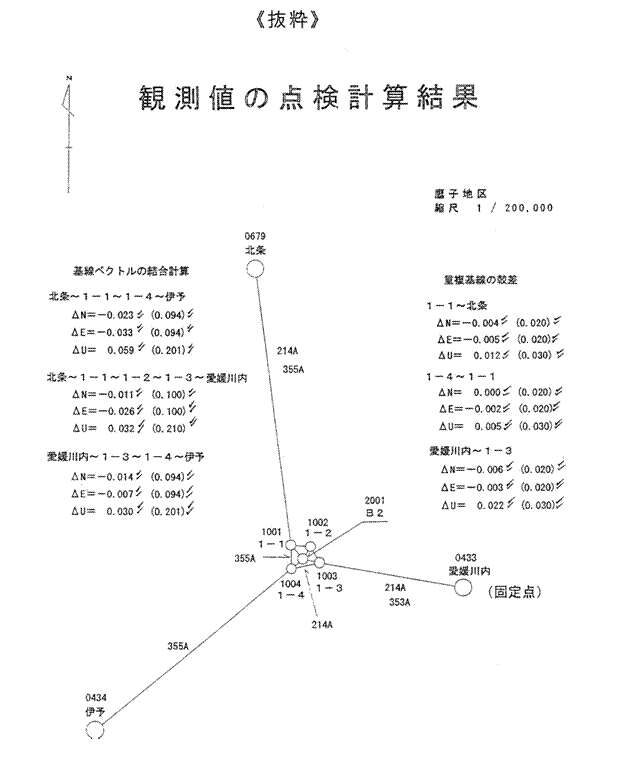 4.3.2 基線解析 基線解析とは、GPS衛星の電波信号から2点間の位置関係を求めることである。 初回の1級図根点の結果、電子基準点の既知点から既知点へ結合する点検計算の高さ成分について気になっていた。 電子基準点愛媛川内の状況を現地調査した結果、近くに新しい建物が建築され、上空の視界が少し遮られていた。 結果の改善:処理に関する考察として、解析ソフトの説明書にはこう書かれている。 WAVeによる整数値の解析を成功させるには、注意深くデータを編集することでより良い解を得られる場合もあります。データの編集は衛星の軌道の一部についてひとつまたは複数の観測を除去、または無視することです。これには下に示すとおり幾つかの方法があります。 @ 仰角マスクの角度を増加する A 処理の開始および終了時刻を変更する B 衛星による観測を使用できなくする 仰角マスクの角度を増加すると、低い高度にある衛星全体のデータが得られなくなるため、基線解析の処理の開始時刻と終了時刻を少しずつ変え、レシオとリファレンス バリアンスそして高さの結合結果を見ながら計算を行なうことにより、全体的に初回より良い結果を得ることが出来た。 基線ベクトルの結合計算 〔儷〕 (以下、単位:m)